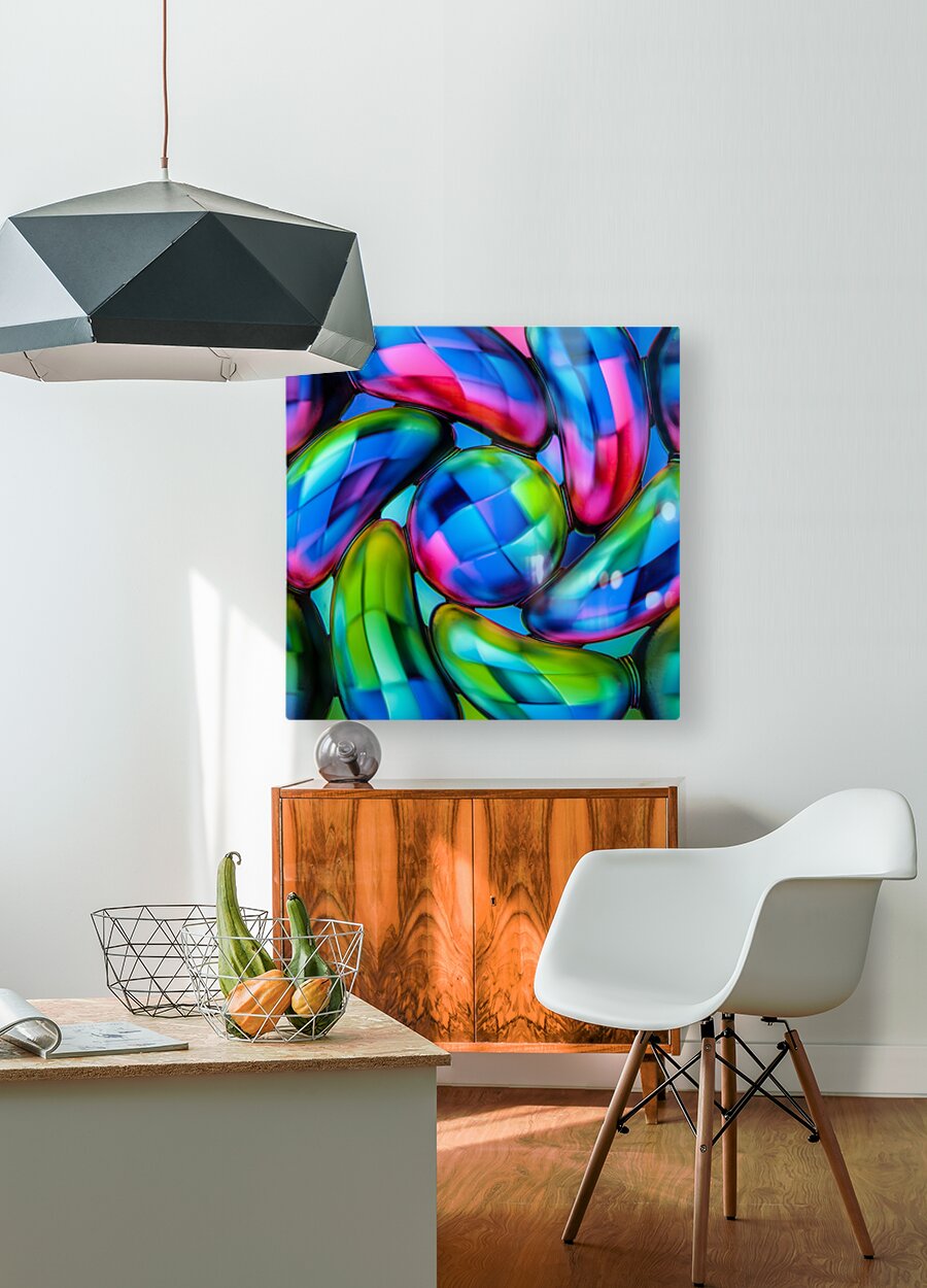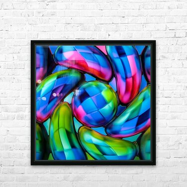 A vibrant abstract macro photograph showcasing colorful squares through warped and distorted orbeez creating a unique interplay of patterns textures and vivid hues. A great photograph for collectors of contemporary art interior decorators looking for bold statement pieces or anyone seeking visually striking artwork that adds a modern abstract touch to their home or office.
