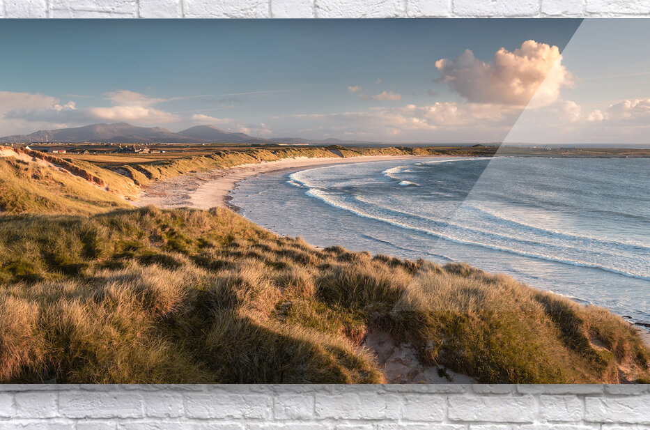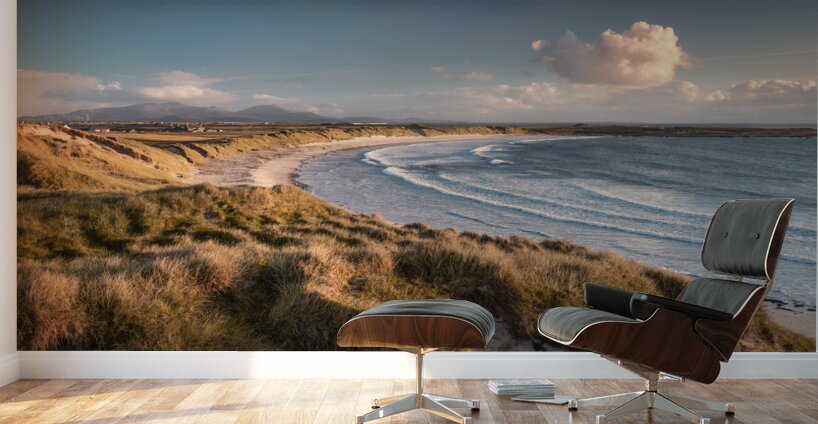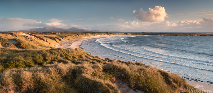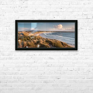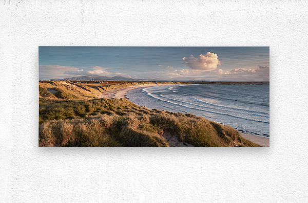 A panoramic view of a sandy beach on the Isle of Uist Outer Hebrides Scotland captured in soft evening light. The sunlight highlights the natural contours of the sand dunes creating a serene and peaceful scene in this remote coastal area. A great photograph for those seeking tranquil landscapes that reflect the beauty of Scotland’s untouched wilderness.