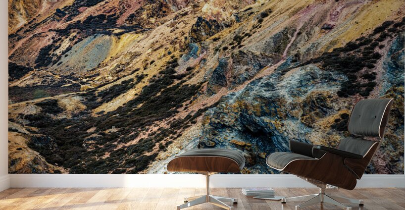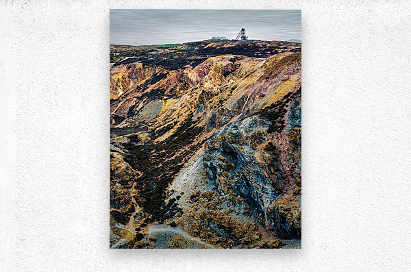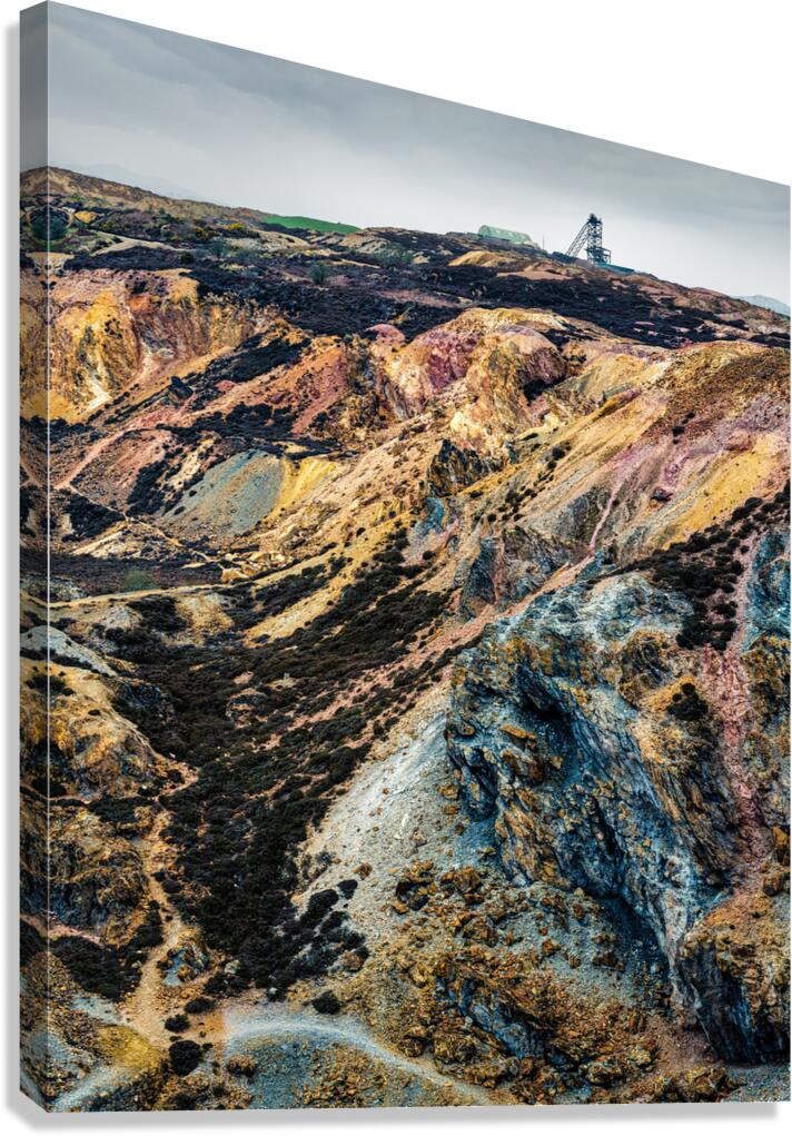A vibrant view of the colourful landscape at Parys Mountain Mynydd Parys an abandoned copper mine on the Isle of Anglesey North Wales. Rich mineral deposits create a striking mix of reds oranges purples and blues across the rugged terrain capturing the unique geological history of this remote location. A perfect photograph for those interested in industrial heritage or dramatic Welsh landscapes.
