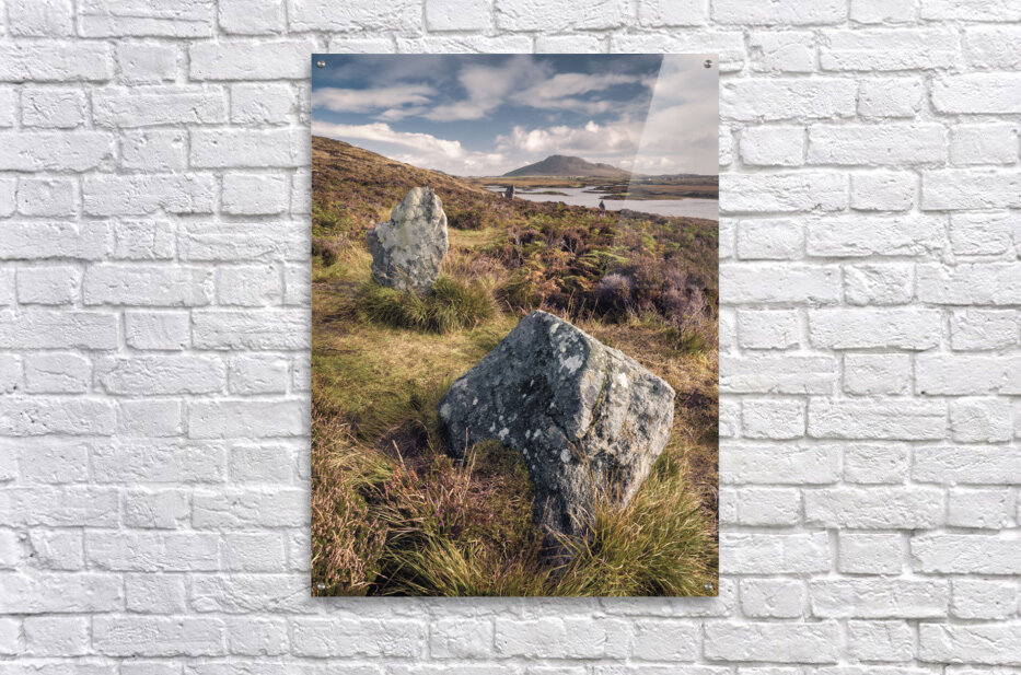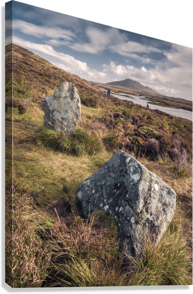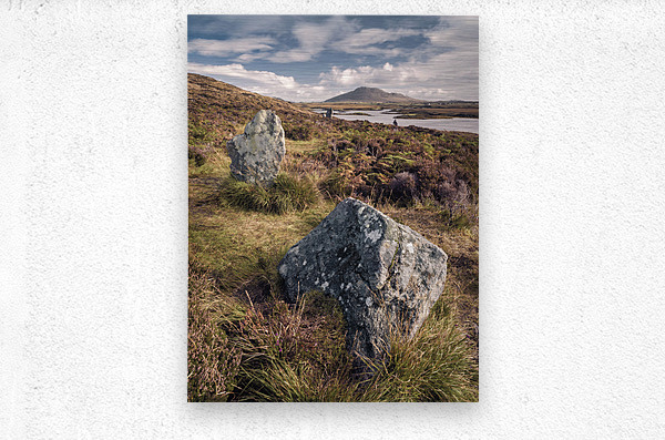 A photograph showcasing a section of the Pobull Fhinn Stone Circle on the Isle of North Uist in the Outer Hebrides Scotland. The ancient stone circle ...[+]