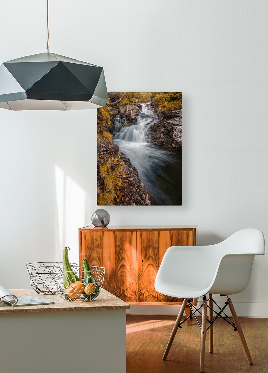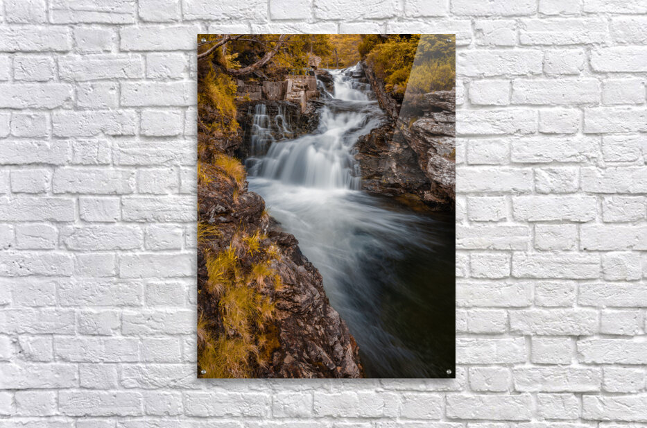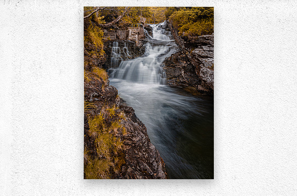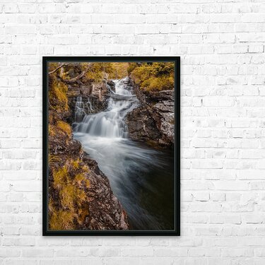 A photograph capturing a waterfall on Lui Water located in Linn of Dee near Braemar in Aberdeenshire Scotland. The cascading water flows through the rugged rock formations of the Scottish Highlands offering a serene and natural landscape. A great photograph for nature lovers landscape enthusiasts or those with an interest in Scottish scenery.