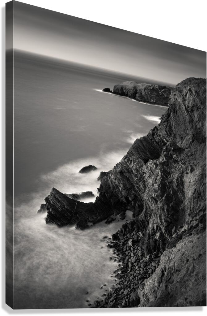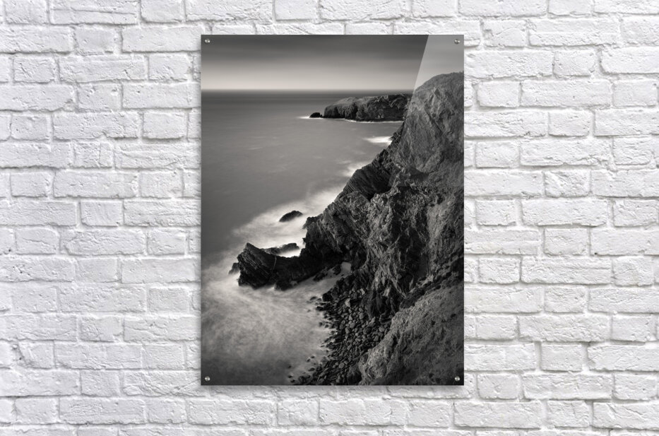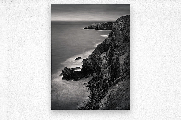 A monochrome photograph capturing the rugged coastline near Llangrannog in Ceredigion West Wales. The image showcases the natural textures of the cliffs and the turbulent sea below offering a striking portrayal of this coastal landscape. A great photograph for those seeking evocative atmospheric imagery of the Welsh coast.