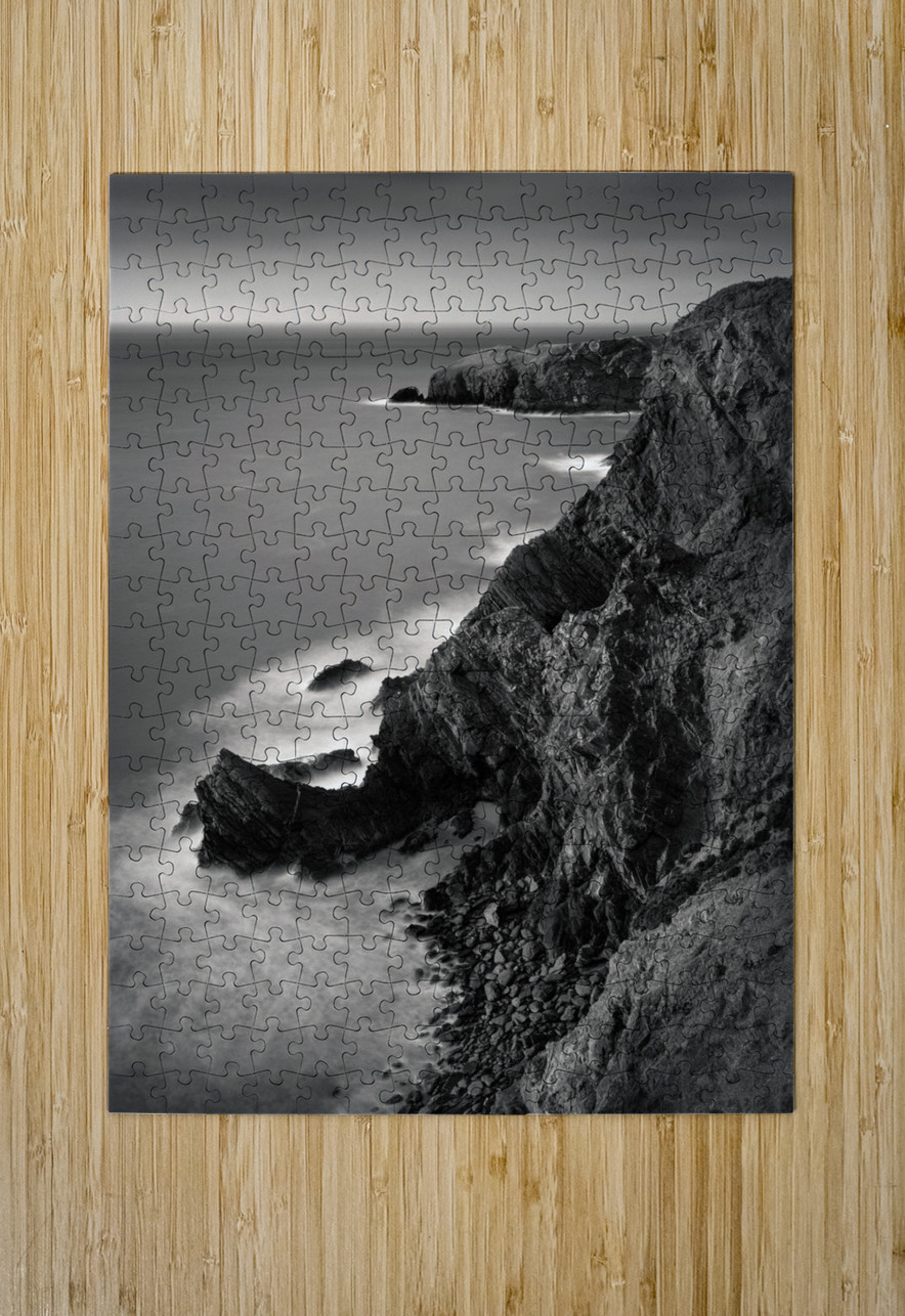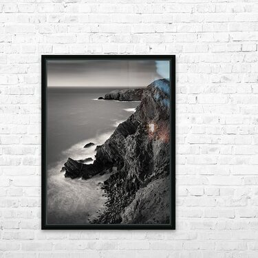 A monochrome photograph capturing the rugged coastline near Llangrannog in Ceredigion West Wales. The image showcases the natural textures of the clif...[+]