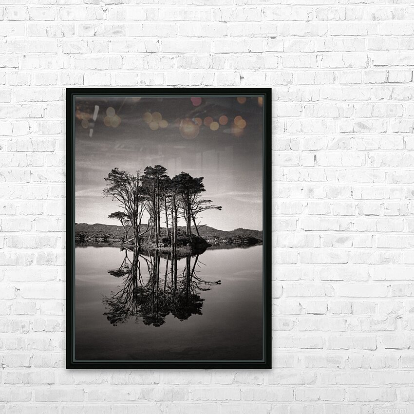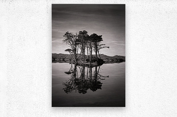 A monochrome photograph of a small group of trees reflected in the still waters of Loch Assynt set against the peaceful landscape of the Scottish High...[+]