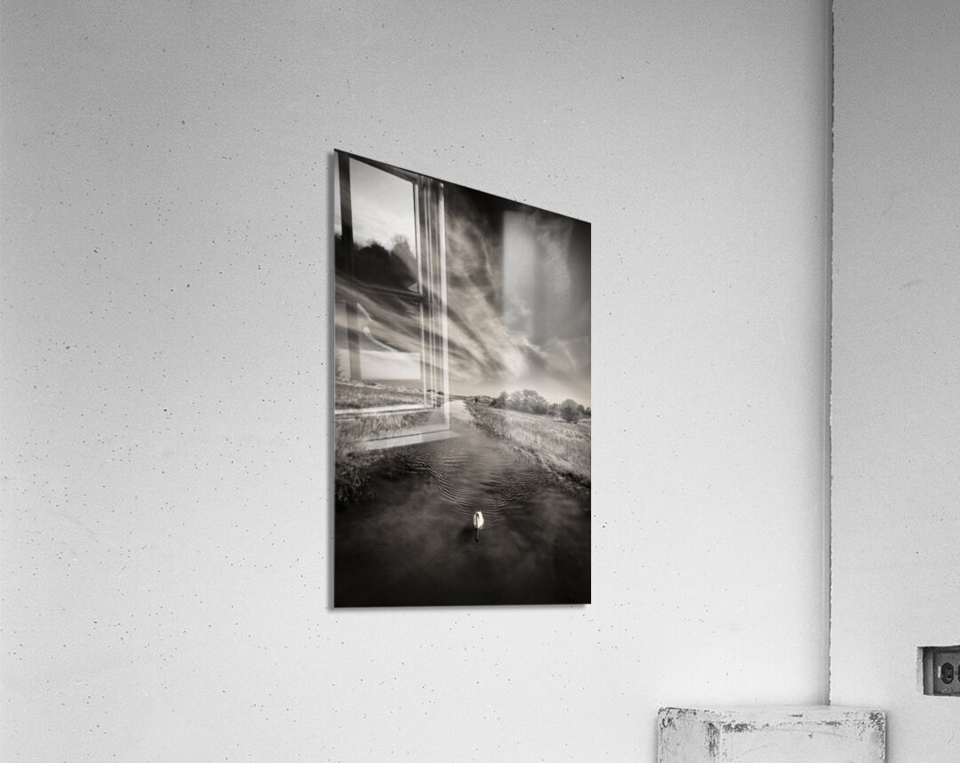A monochrome photograph of a lone white swan gliding along an empty river in North Wales. The remote landscape and tranquil atmosphere are captured under a sky with soft wispy clouds creating a peaceful minimalist scene. A perfect photograph for nature lovers or those seeking serene imagery to complement calm quiet spaces.