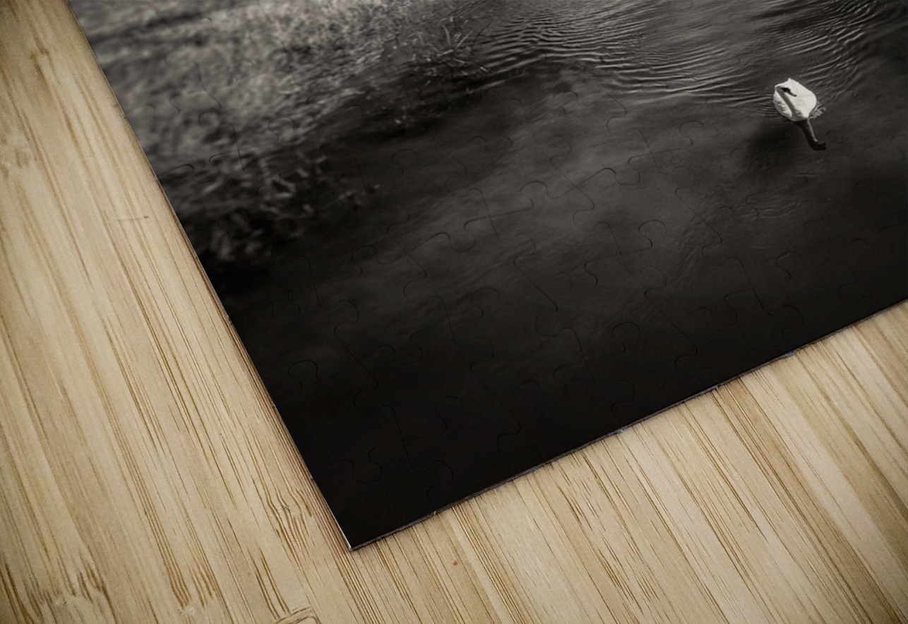 A monochrome photograph of a lone white swan gliding along an empty river in North Wales. The remote landscape and tranquil atmosphere are captured un...[+]