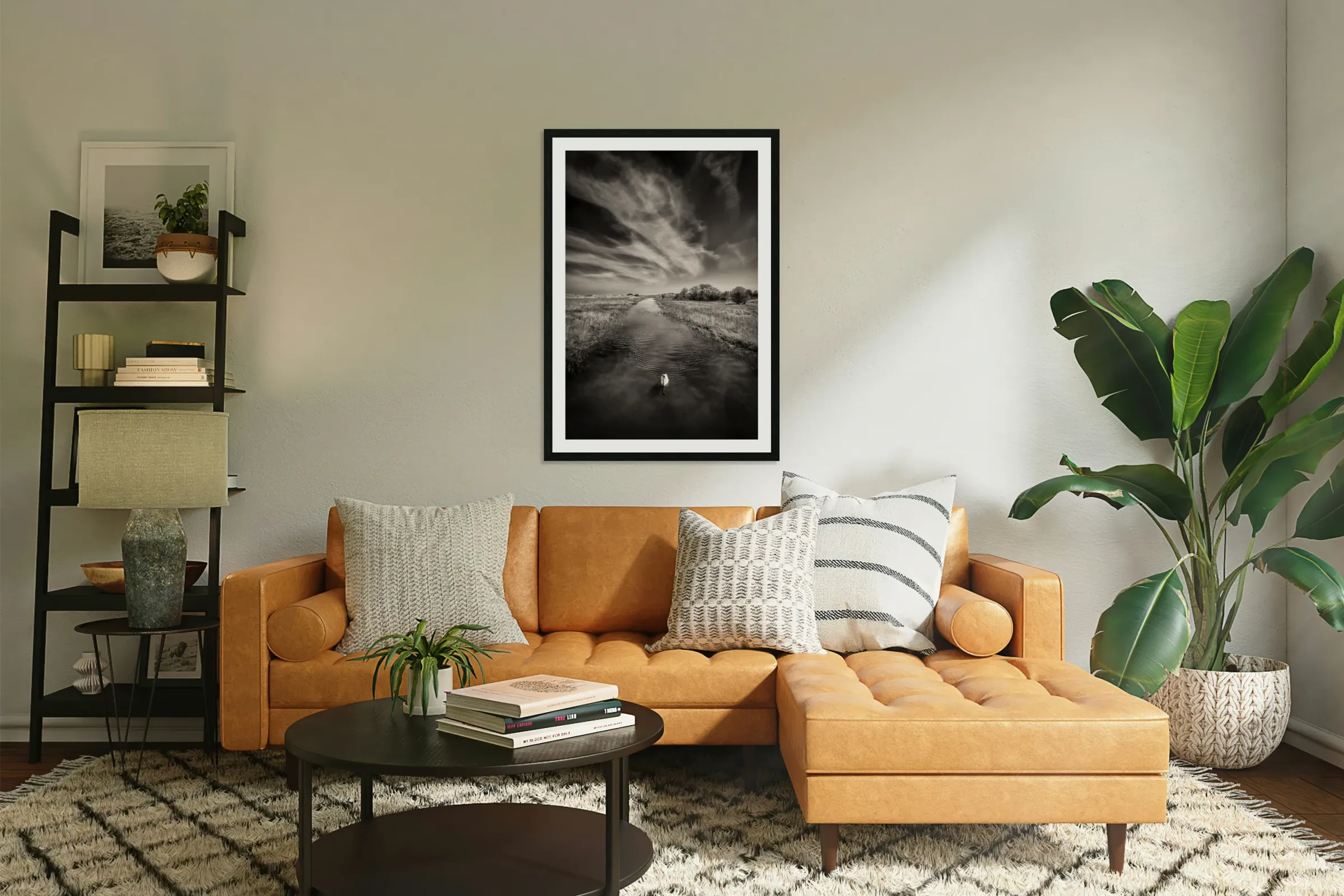 A monochrome photograph of a lone white swan gliding along an empty river in North Wales. The remote landscape and tranquil atmosphere are captured under a sky with soft wispy clouds creating a peaceful minimalist scene. A perfect photograph for nature lovers or those seeking serene imagery to complement calm quiet spaces.