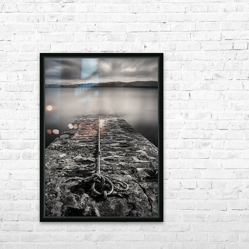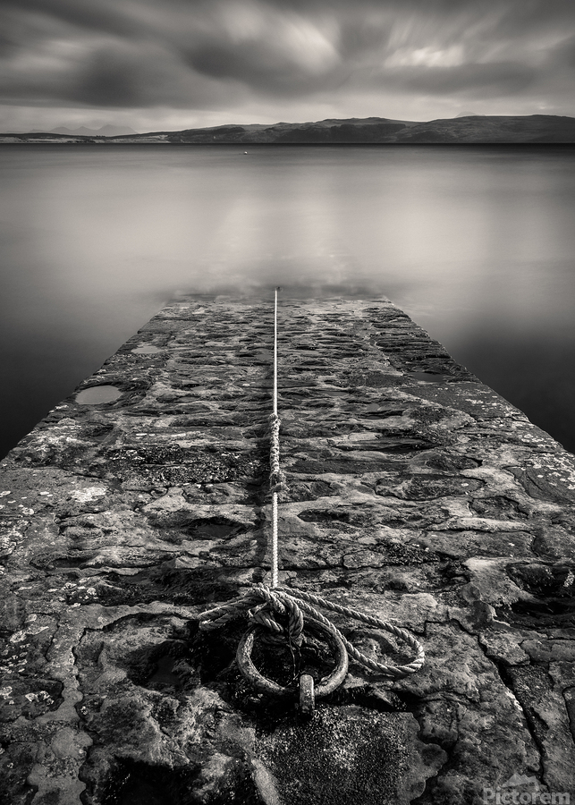 A monochrome long exposure photograph of a mooring ring and rope stretching into Loch Ewe taken from a stone launching ramp near Midtown in the Scotti...[+]