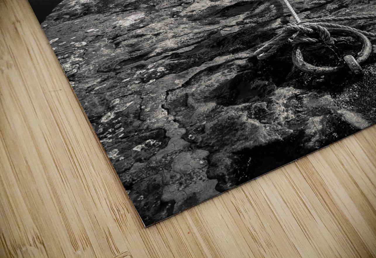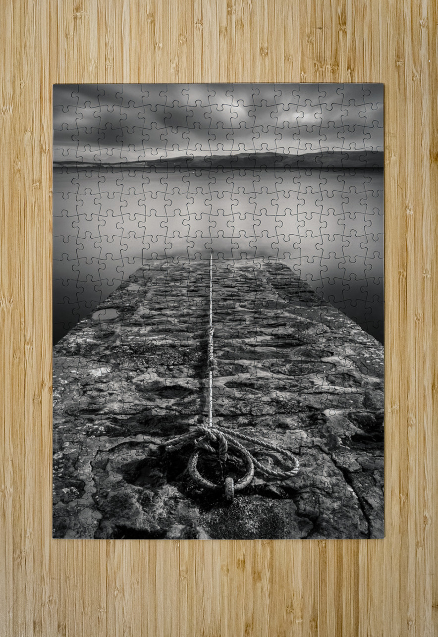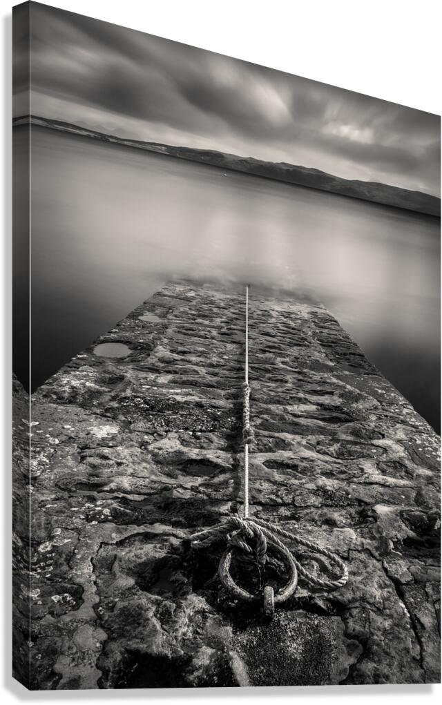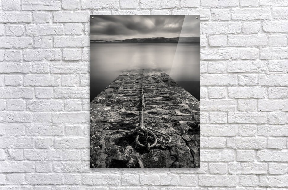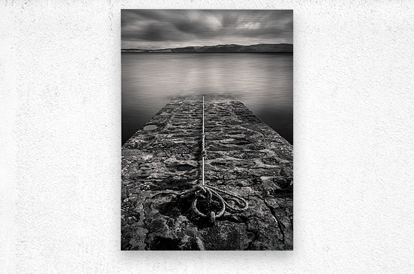 A monochrome long exposure photograph of a mooring ring and rope stretching into Loch Ewe taken from a stone launching ramp near Midtown in the Scottish Highlands. The calm water contrasts with the textured foreground creating a striking coastal scene. A great photograph for those seeking minimalist and atmospheric seascapes or nautical-themed artwork.