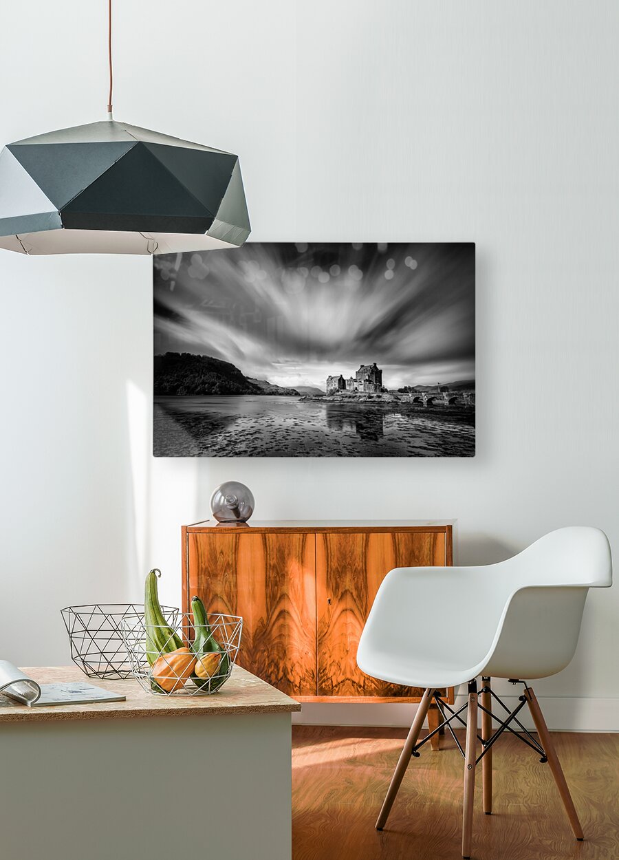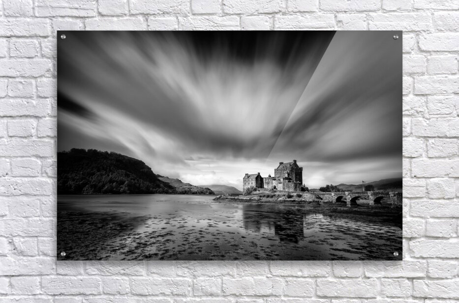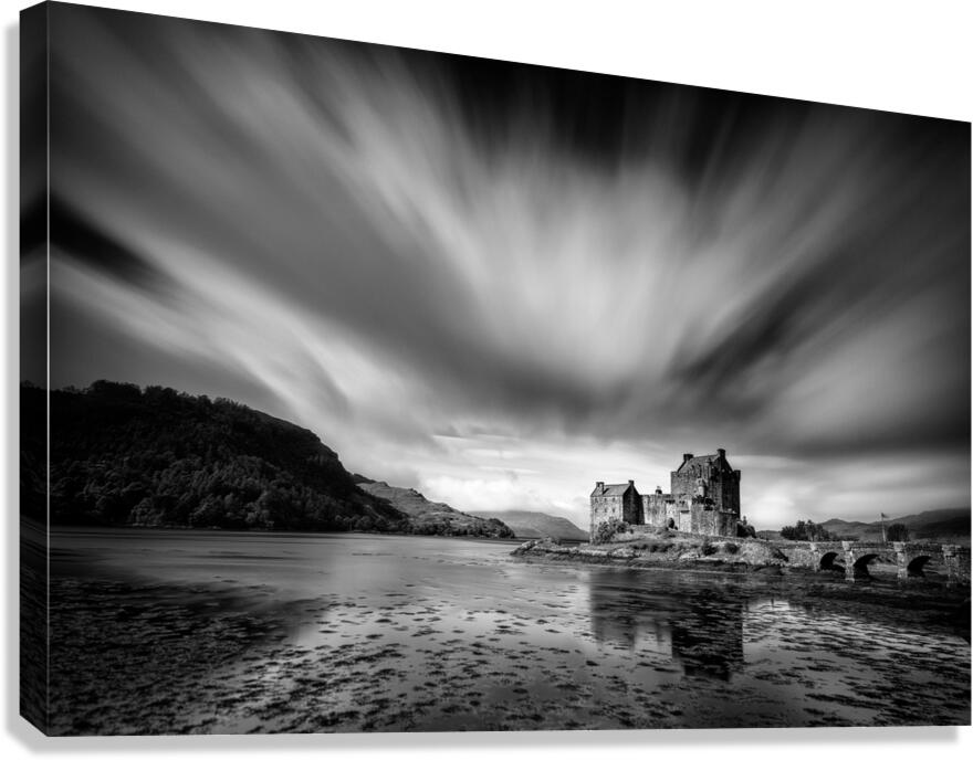 A black and white long exposure photograph capturing Eilean Donan Castle in the Scottish Highlands. The dramatic movement of clouds enhances the ethereal quality of the scene highlighting the castles architectural beauty against a dynamic sky. This photograph evokes a sense of history and majesty making it a perfect photograph for collectors of landscape art and lovers of Scottish heritage.