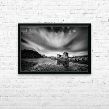 A black and white long exposure photograph capturing Eilean Donan Castle in the Scottish Highlands. The dramatic movement of clouds enhances the ether...[+]
