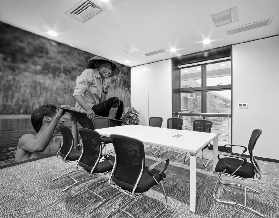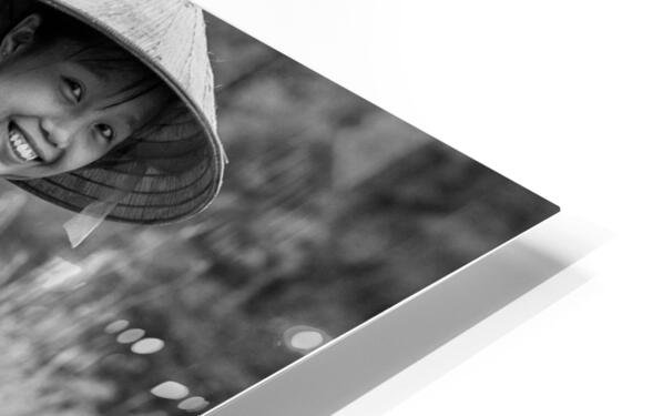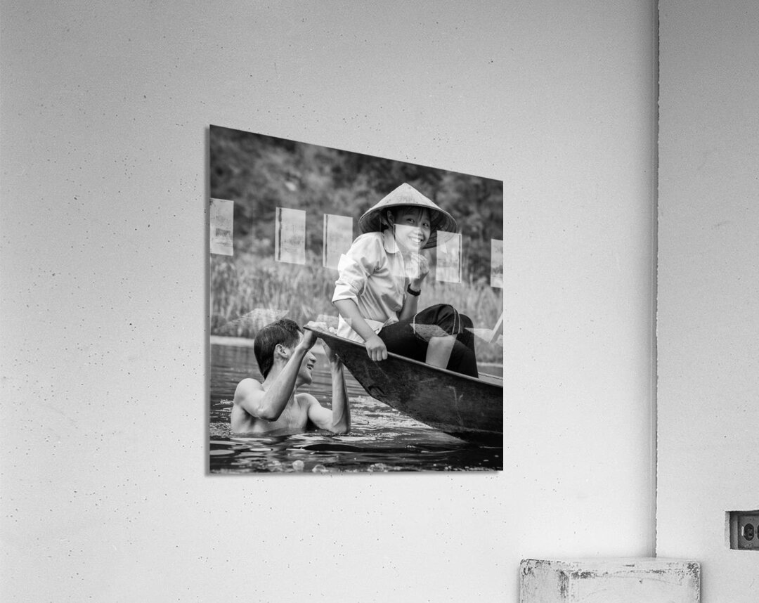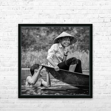 A monochrome photograph capturing a young Vietnamese couple enjoying a playful moment on the Yen River in Vietnam 2006. The image features a smiling girl wearing a traditional nón lá conical hat as she sits in the boat while a young man pushes the boat from behind in the water. This scene highlights the joy and simplicity of life along the river. A great photograph for those seeking to add cultural charm and warmth to their collection