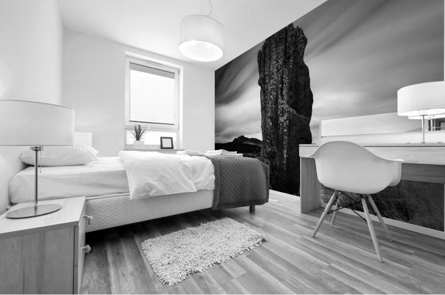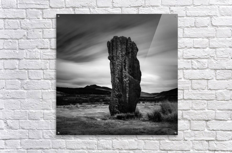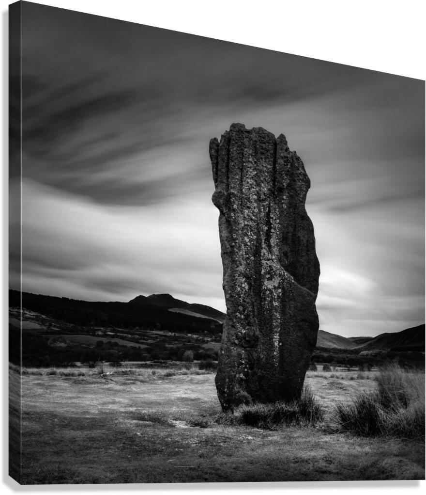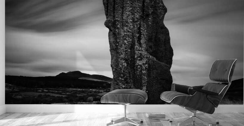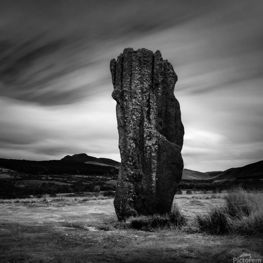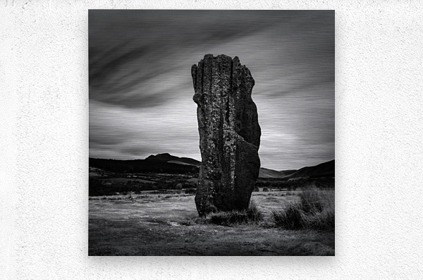 A black-and-white long exposure photograph featuring one of the renowned stones at Machrie Moor Stone Circle on the Isle of Arran Scotland. This image...[+]