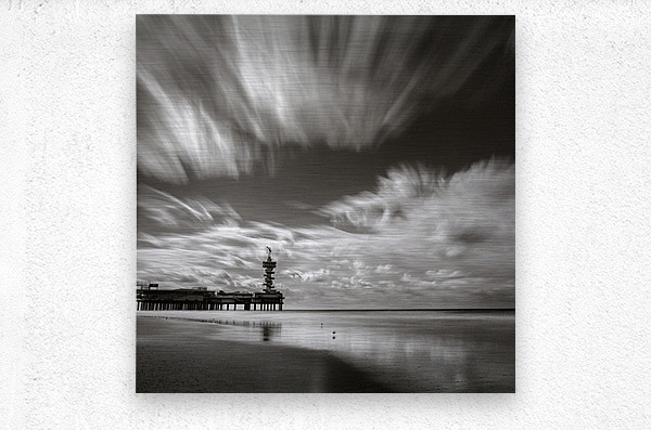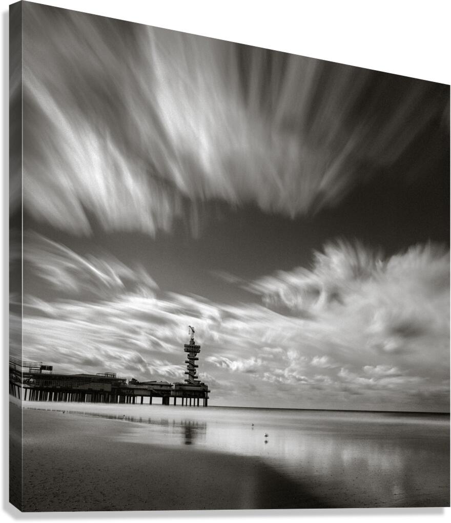 A monochrome long exposure photograph of the view along the beach towards Scheveningen Pier Netherlands taken on analog film. The long exposure creates a dramatic effect in the sky with clouds appearing as soft sweeping forms above the smooth sand and waves contrasting with the distant silhouette of the pier. The ideal photograph for collectors of fine art photography and those seeking a striking coastal scene.