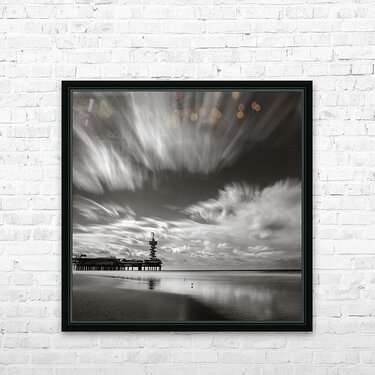A monochrome long exposure photograph of the view along the beach towards Scheveningen Pier Netherlands taken on analog film. The long exposure create...[+]