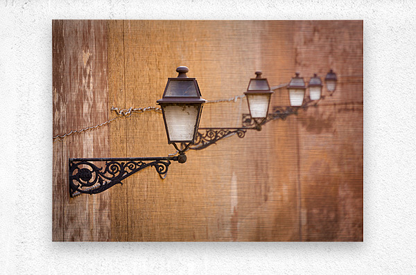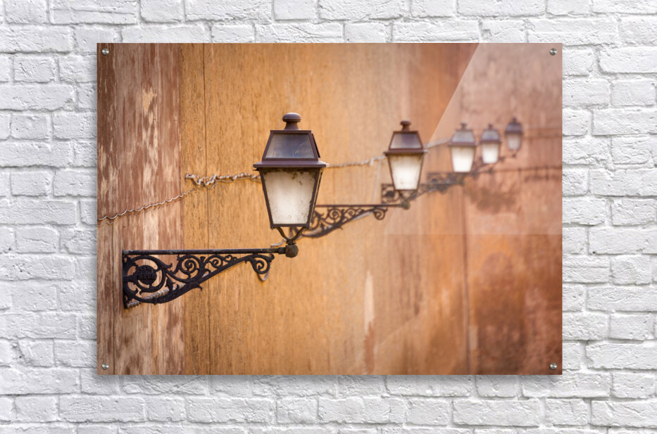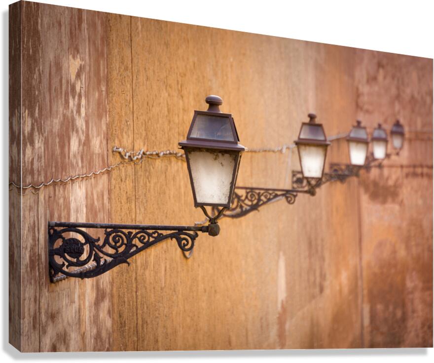 A row of vintage ornate street lamps in Rome Italy gracefully attached to a rustic stone wall. The composition highlights the intricate details of the lamps against the textured backdrop creating a timeless scene. A great photograph for those who appreciate historic architecture and classic European charm.