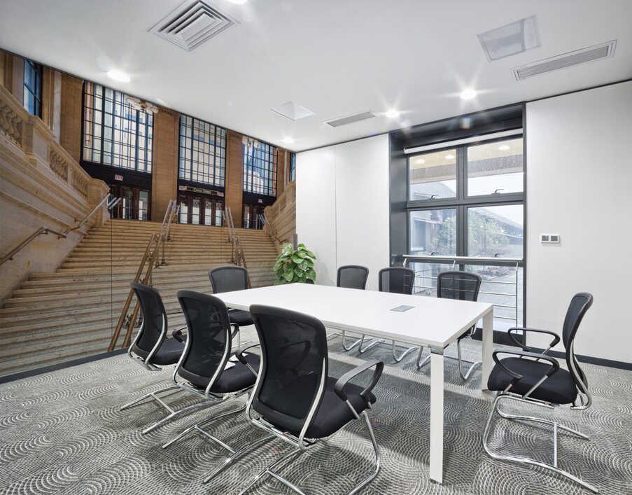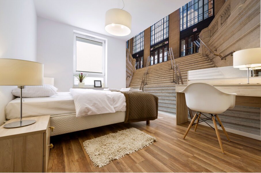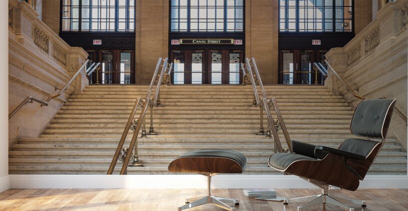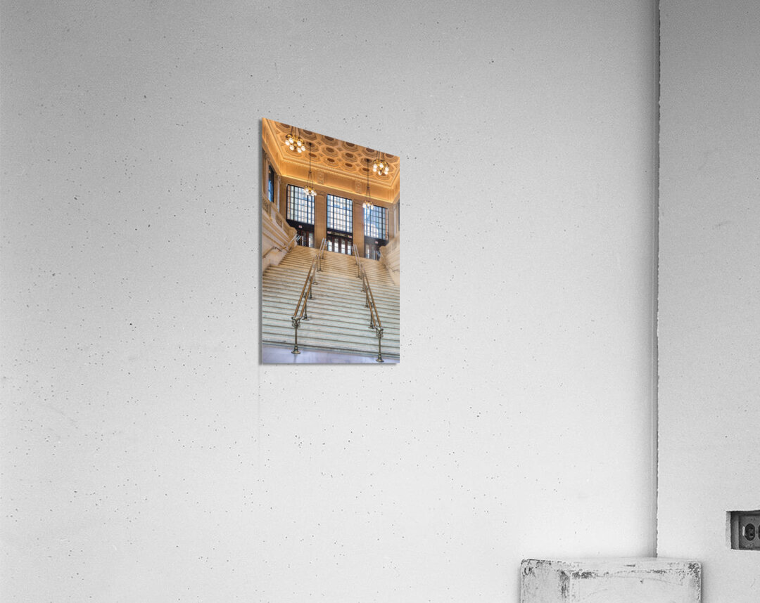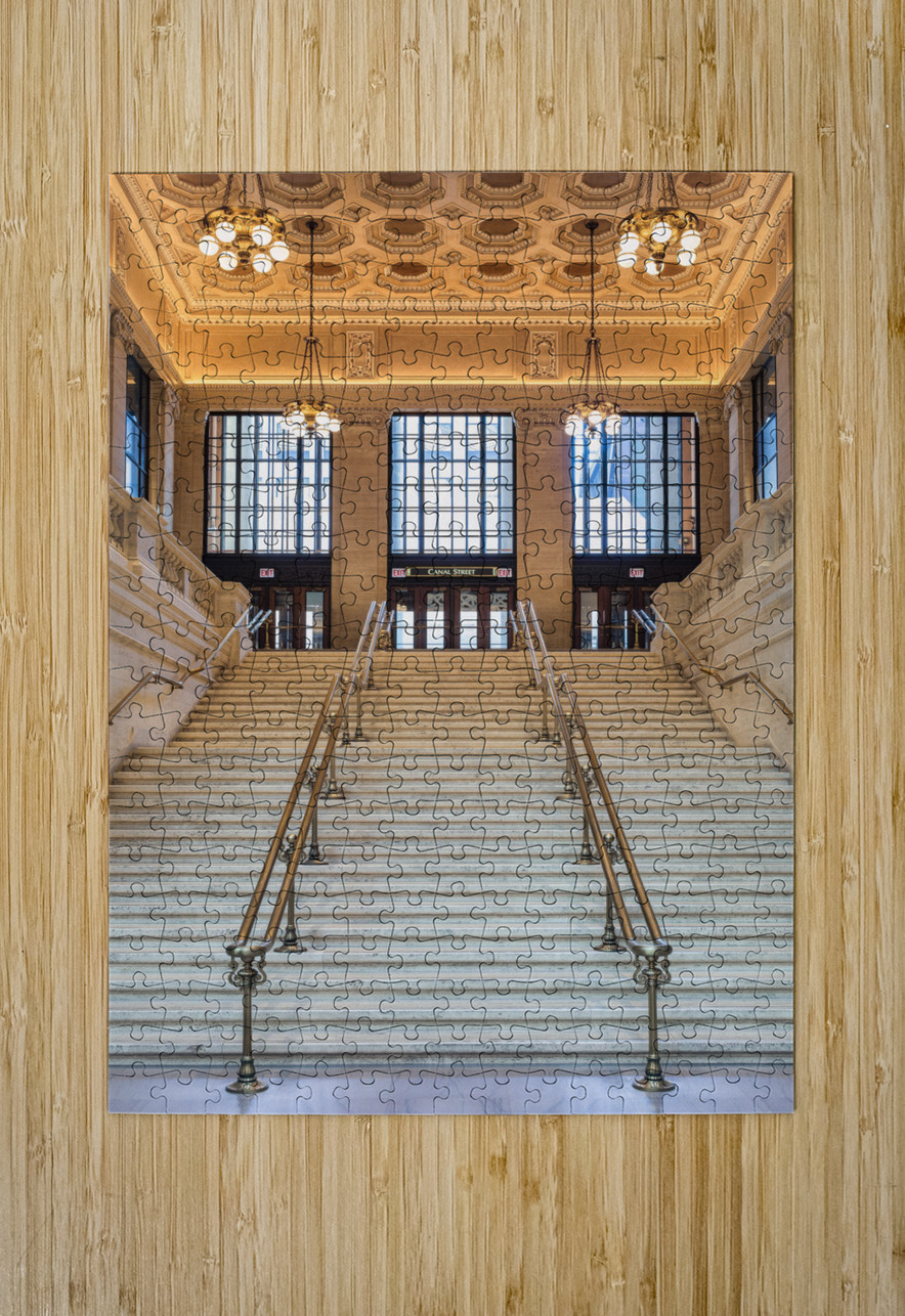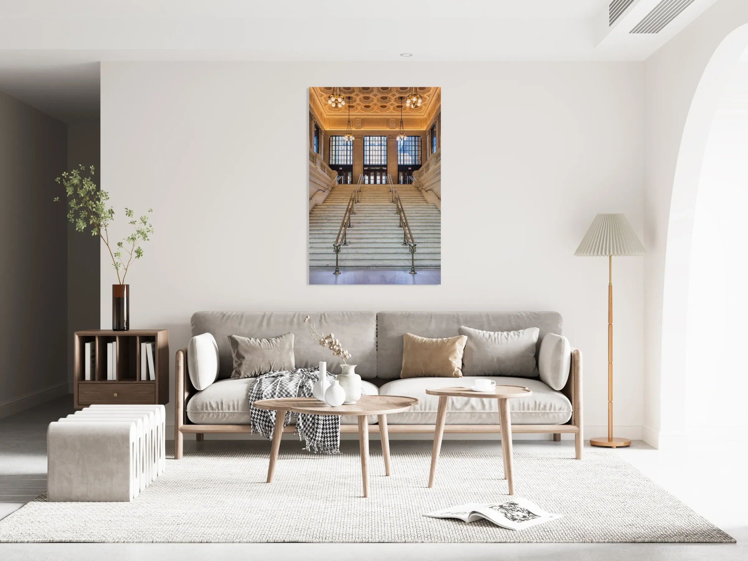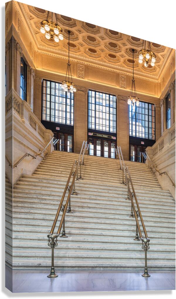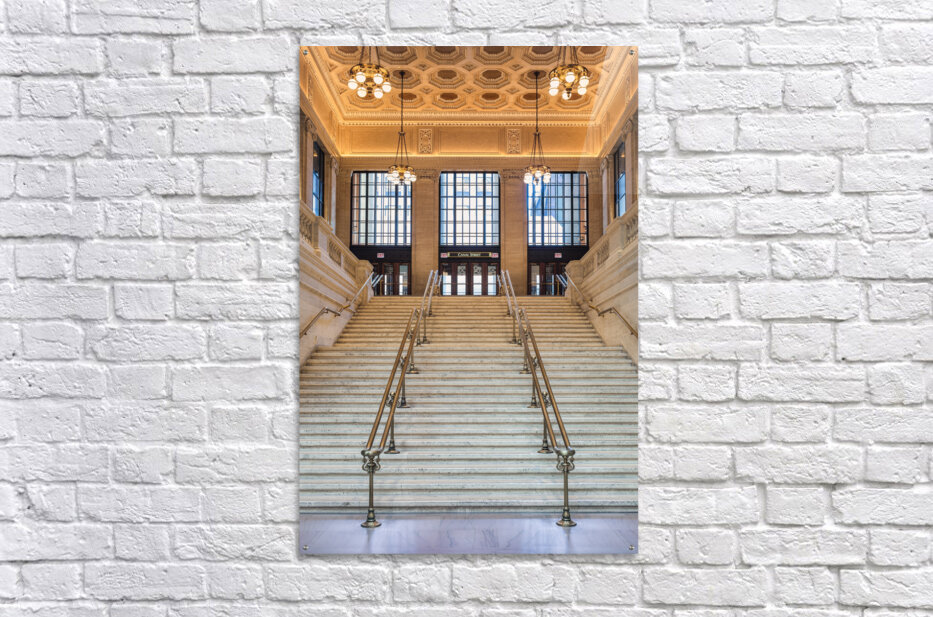 A view looking up the iconic steps of Union Station toward the Canal Street entrance in Chicago capturing the grandeur of this historic train station. Known for its role in the gunfight scene from the film The Untouchables the composition reflects a piece of cinematic and architectural history. A great photograph for movie enthusiasts architecture admirers or those with a connection to Chicago’s rich heritage.