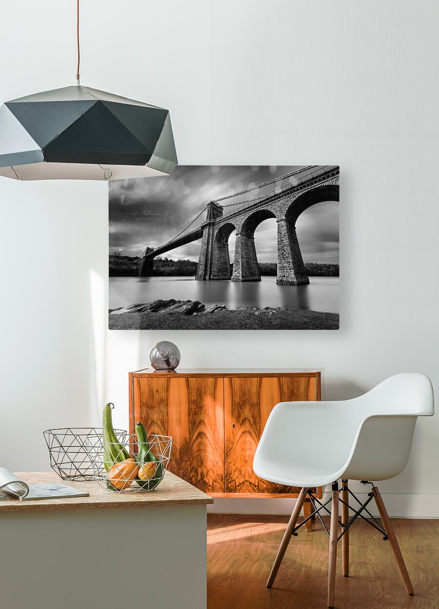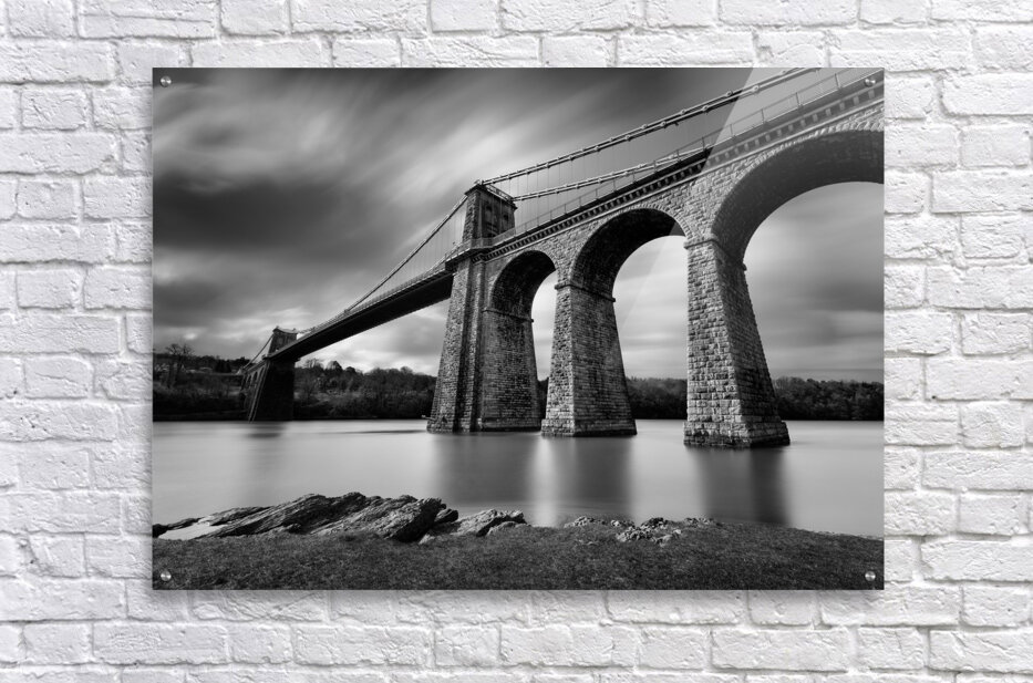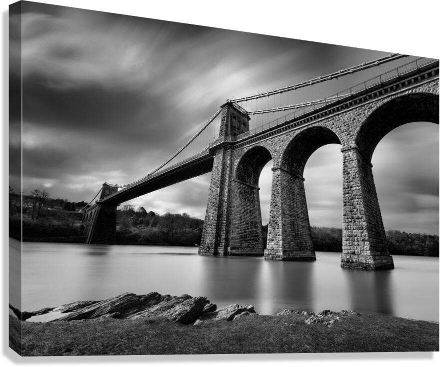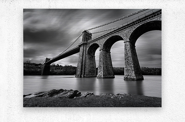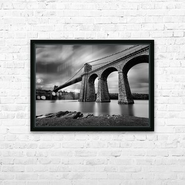 A monochrome long-exposure photograph of the Menai Suspension Bridge in Anglesey North Wales taken from the banks of the Menai Strait. Designed by Tho...[+]
