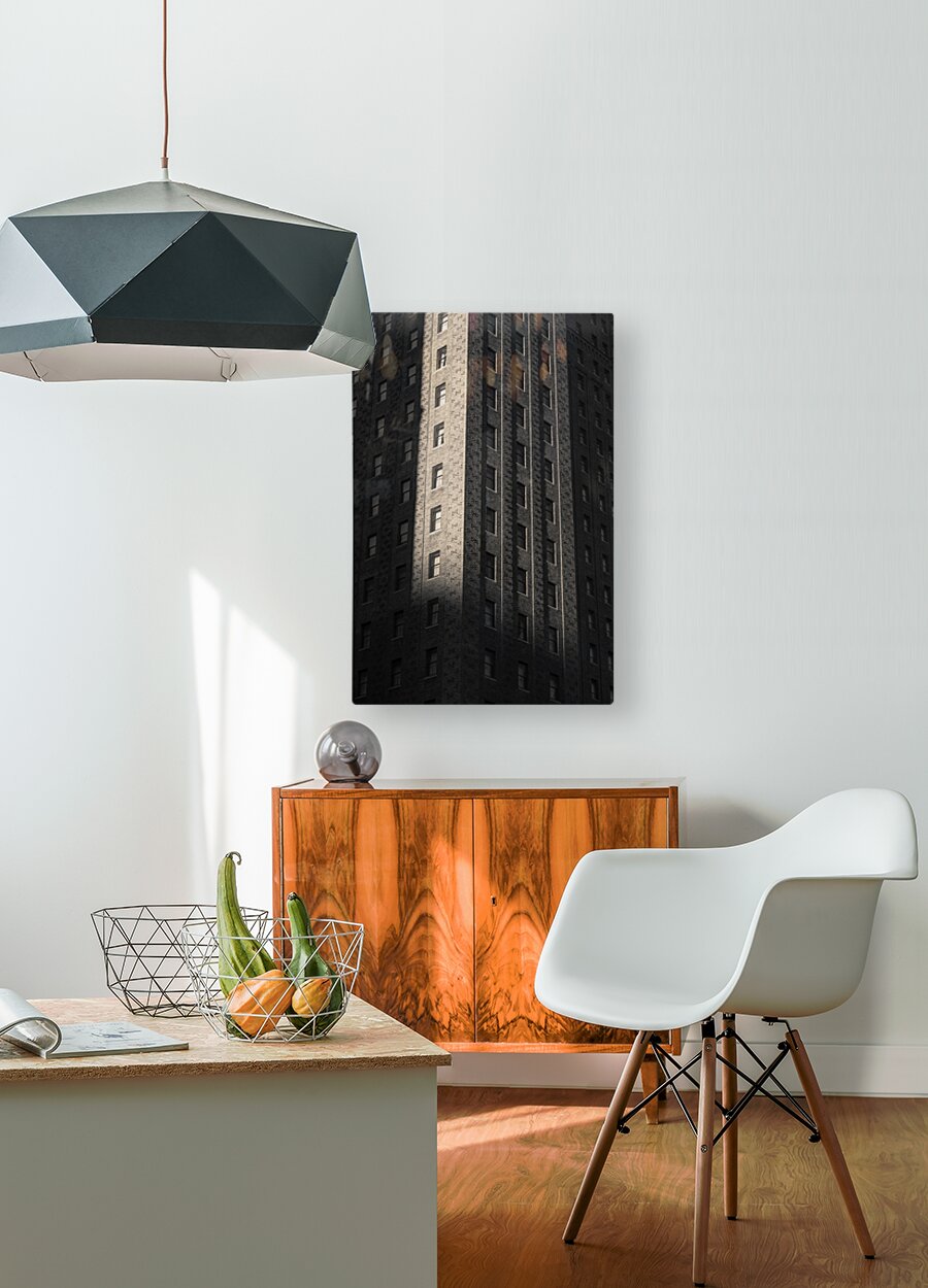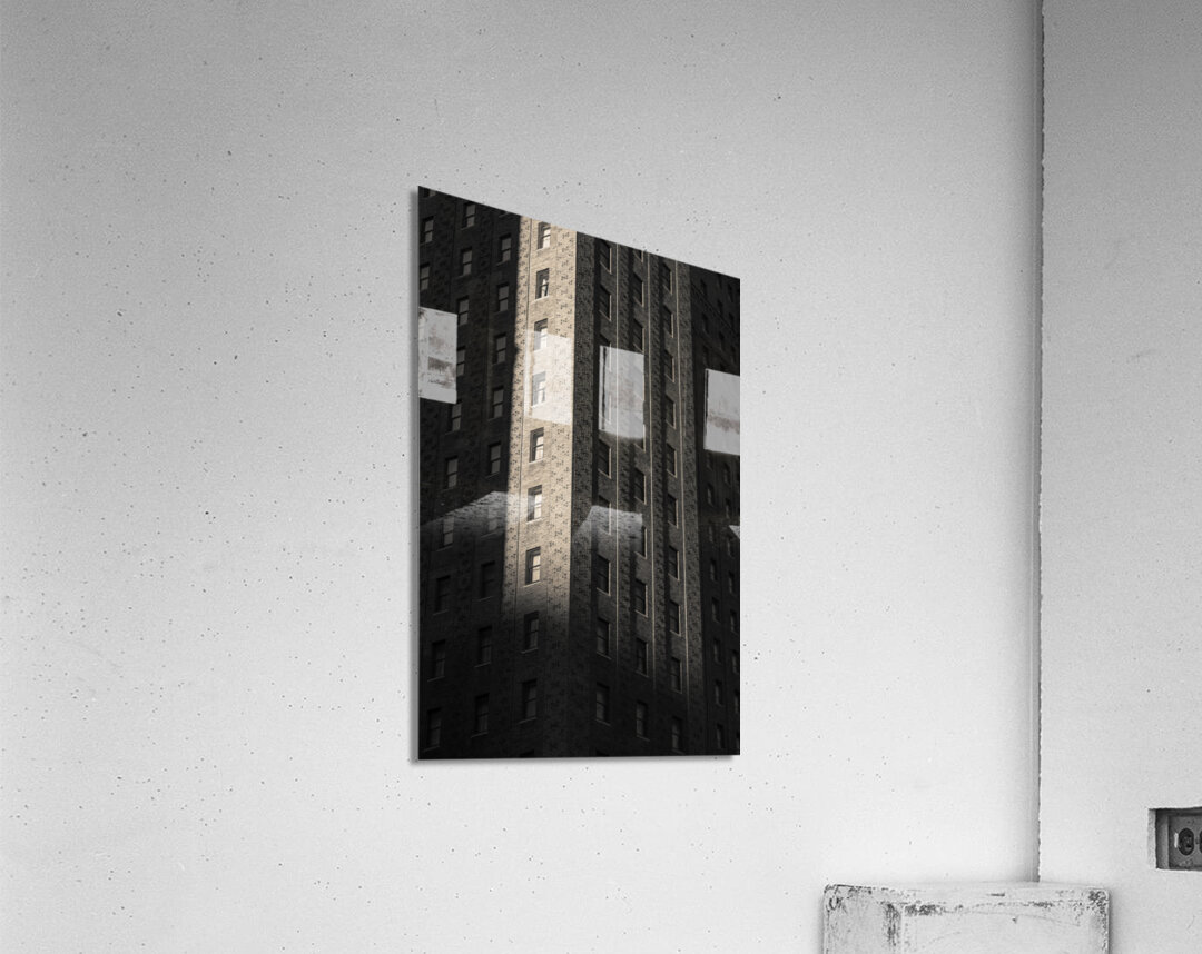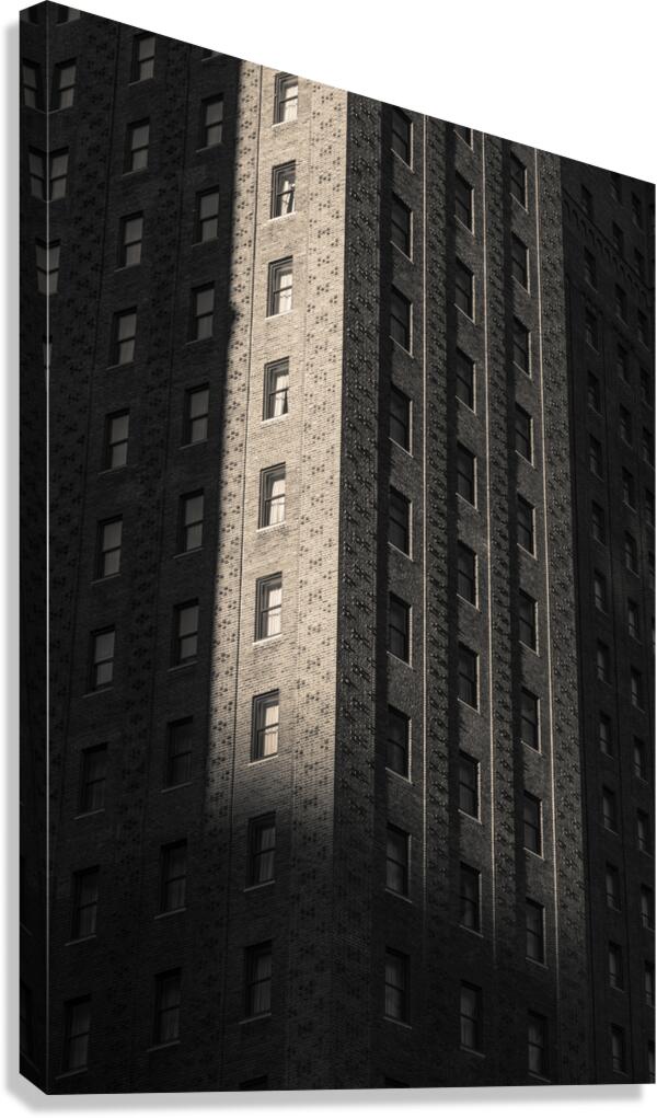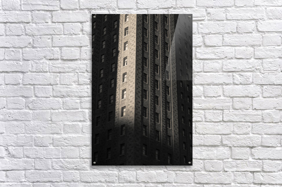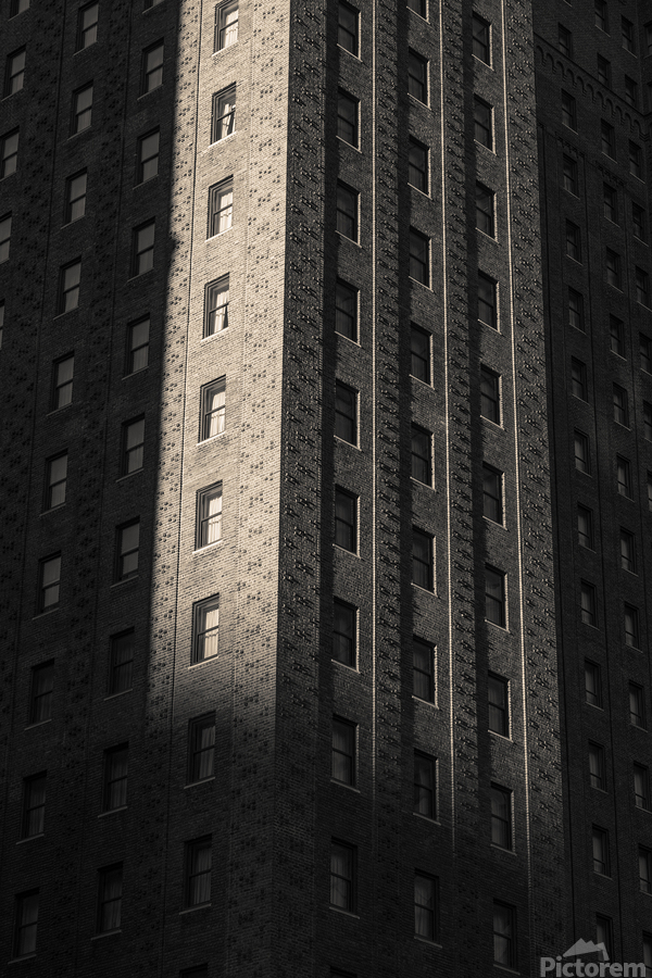 A late afternoon view of the historic Allerton Hotel in Chicago captured in monochrome with the interplay of light and shadow highlighting a section of its iconic architecture. Opened in 1924 this landmark hotel is renowned for its distinctive brick facade and timeless design. Located on Michigan Avenue the Allerton holds a significant place in the citys architectural history once home to the famous Tip Top Tap lounge. An ideal photograph for architecture enthusiasts or collectors of Chicago cityscapes.