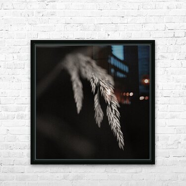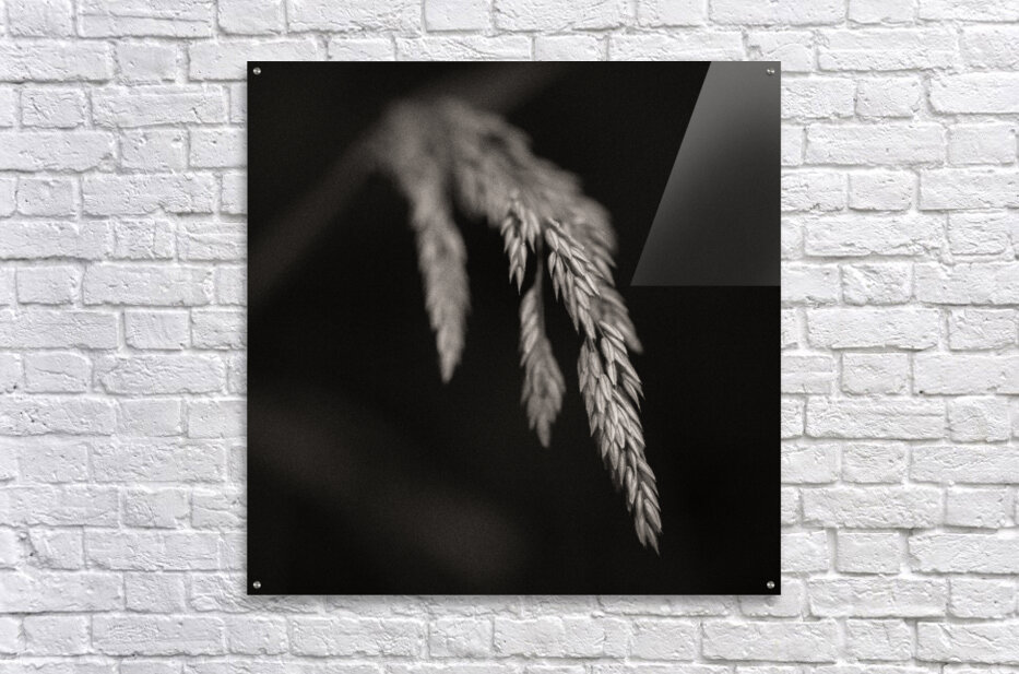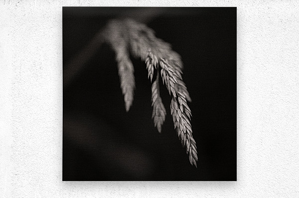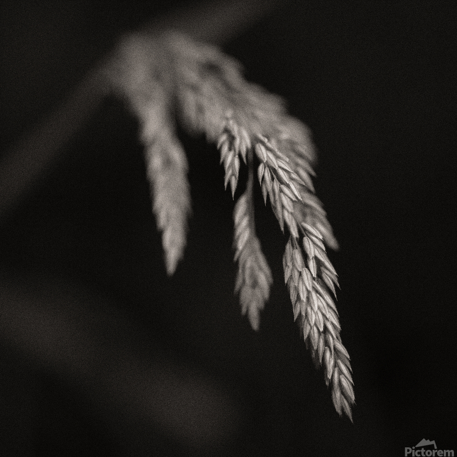 A monochrome study of wild grass seed pods captured in a woodland setting. The delicate seed head is highlighted against a dark background with a subt...[+]