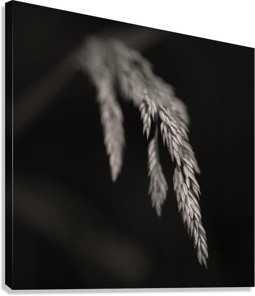A monochrome study of wild grass seed pods captured in a woodland setting. The delicate seed head is highlighted against a dark background with a subtle warm tone and grainy texture evoking a fine art style. The ideal photograph for nature enthusiasts and those seeking a minimalist organic touch in their home or office decor.