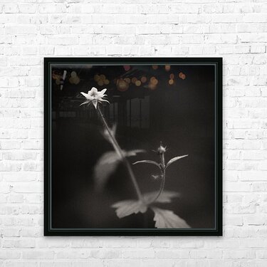 A monochrome image of a white wildflower set against a dark woodland backdrop with soft blurred surroundings that draw attention to its delicate form. The photograph features a slight warm tone and a textured finish adding depth and character to the scene. The ideal photograph for nature lovers and fine art enthusiasts seeking a subtle yet expressive image of the natural world.