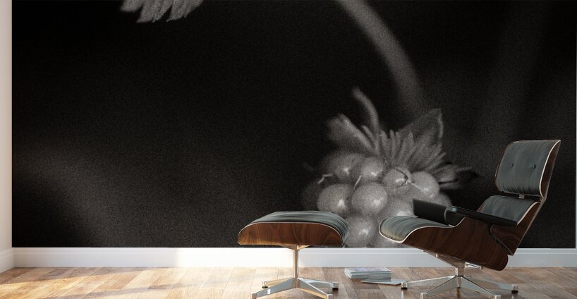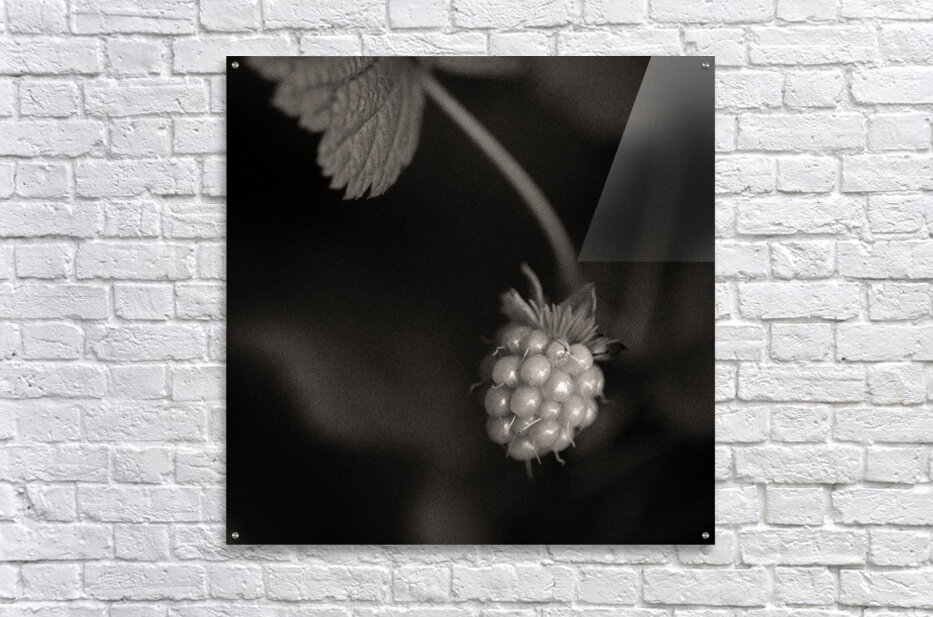 A monochrome study of the emerging fruit of a dewberry plant, set against a dark, blurred background that brings out the fine details of the delicate fruit. The image has a subtle warm tone and a soft, grainy texture, offering a fine art feel. The ideal photograph for nature enthusiasts or those looking to add a touch of organic elegance to their collection.
