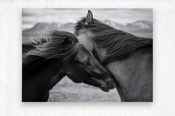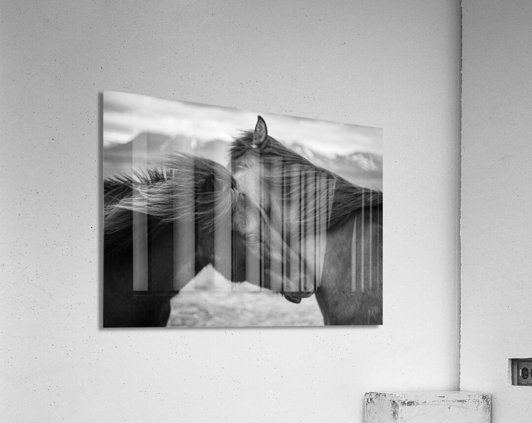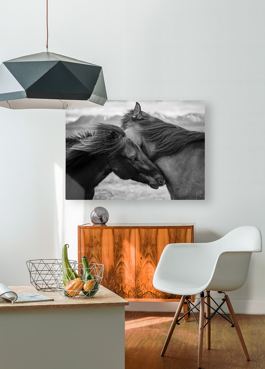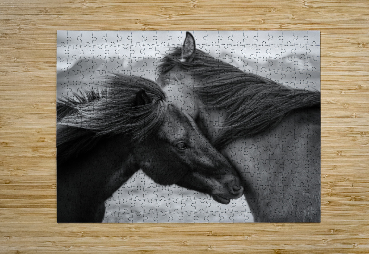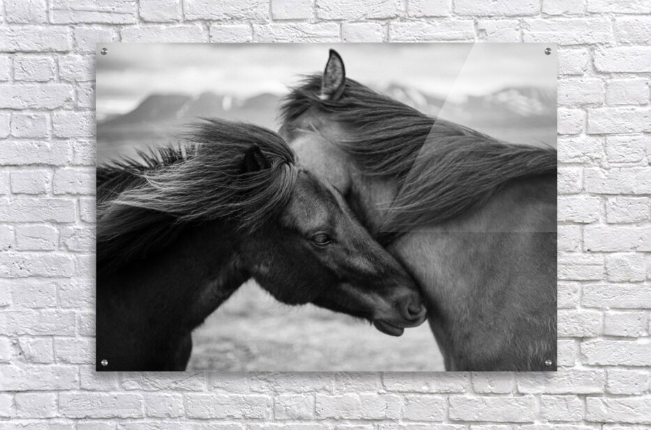 A black and white photograph capturing an intimate moment between two wild Icelandic horses their heads gently pressed together in a display of quiet connection amidst strong gusting winds. In the distant background ice-capped mountains rise emphasizing the raw remote beauty of their environment and the resilience needed to endure such harsh conditions. A powerful photograph for those drawn to the untamed spirit of Iceland’s wilderness and the bond between its creatures.