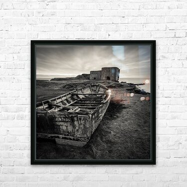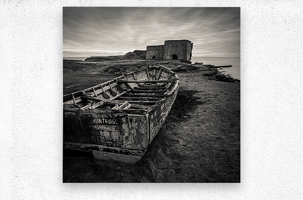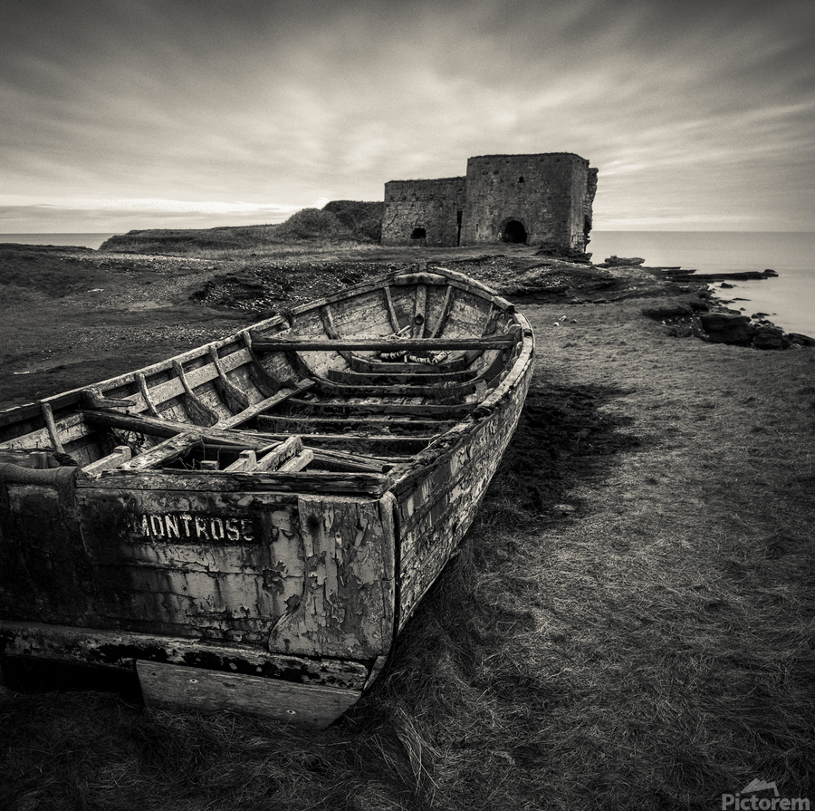 An abandoned boat rests in decay at Boddin Point Angus Scotland its weathered hull telling a story of time and loss. In the background the ruins of old lime kilns stand as quiet witnesses to a bygone era. The stark contrast of textures and tones creates a hauntingly beautiful scene perfect for those drawn to Scotland’s maritime heritage and evocative coastal landscapes. ..... Please note: This image has a slightly grainy texture because it was photographed on analog film.