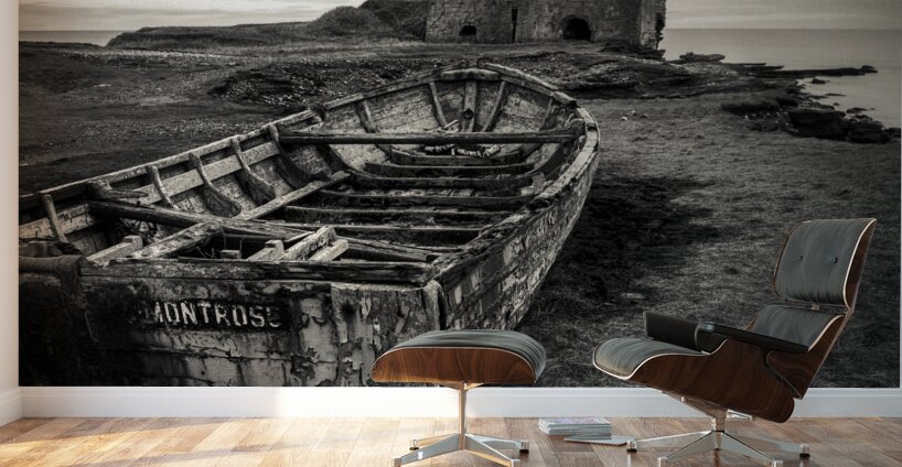 An abandoned boat rests in decay at Boddin Point Angus Scotland its weathered hull telling a story of time and loss. In the background the ruins of ol...[+]