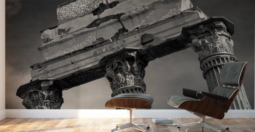 Three ancient pillars stand as the final remnants of a once-grand structure in the Roman Forum Rome Italy. Weathered by centuries they serve as a striking reminder of the city’s historical and architectural legacy. A great photograph for those who appreciate the enduring beauty of ancient ruins.