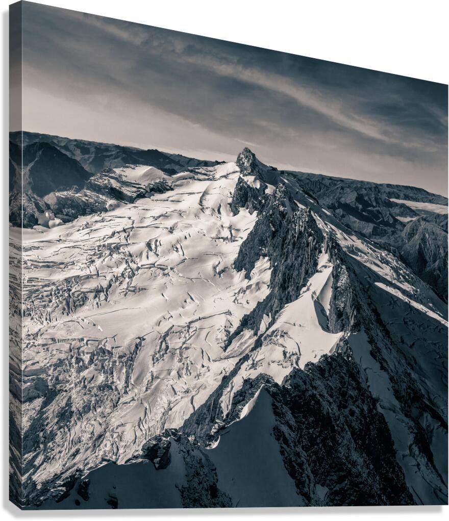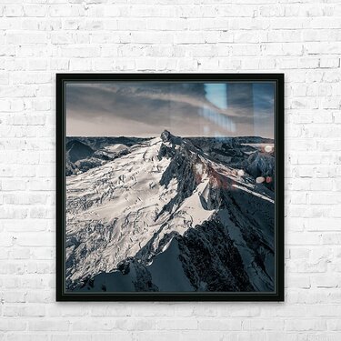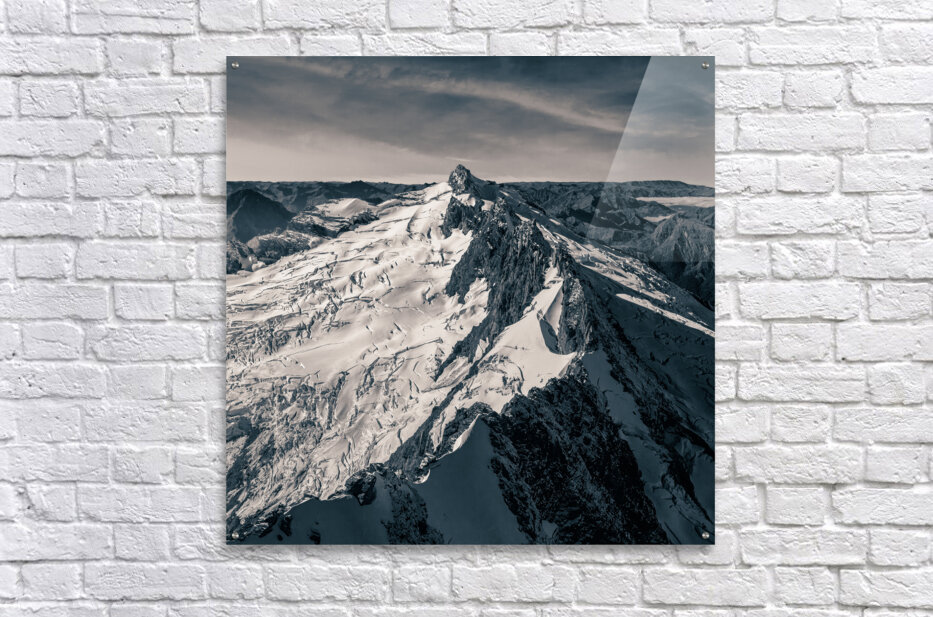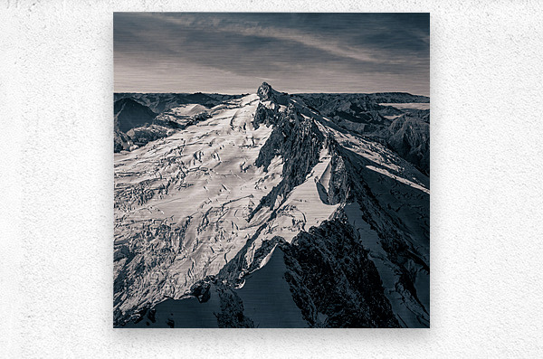 An aerial view of a snow-covered mountain peak in the Southern Alps on New Zealand’s South Island. A jagged ridgeline leads to the lone summit with lower mountains in the distance. Wispy clouds drift across the sky adding to the sense of height and isolation. A great photograph for those captivated by New Zealands alpine landscape and rugged natural beauty.