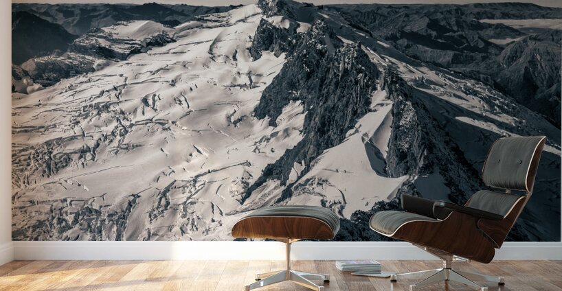 An aerial view of a snow-covered mountain peak in the Southern Alps on New Zealand’s South Island. A jagged ridgeline leads to the lone summit with ...[+]