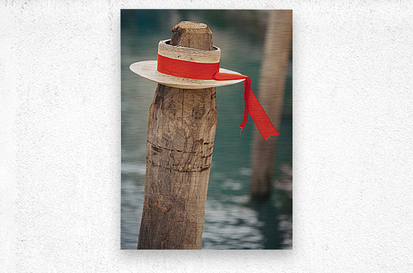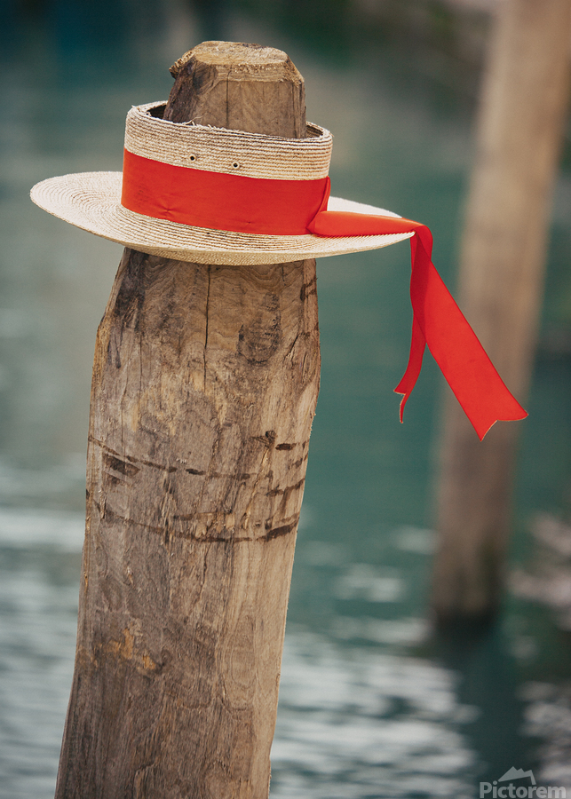 A damaged gondolier’s hat its top missing is pushed over the top of a mooring post in Venice. The red ribbon remains intact adding a splash of color to the scene. The hat weathered by time captures a sense of abandonment and the passage of daily life in the city. A great photograph for those drawn to Venice’s unique atmosphere and the stories hidden in its corners.