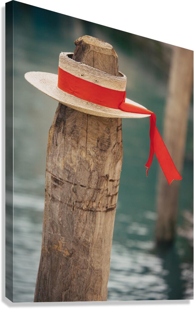 A damaged gondolier’s hat its top missing is pushed over the top of a mooring post in Venice. The red ribbon remains intact adding a splash of color...[+]