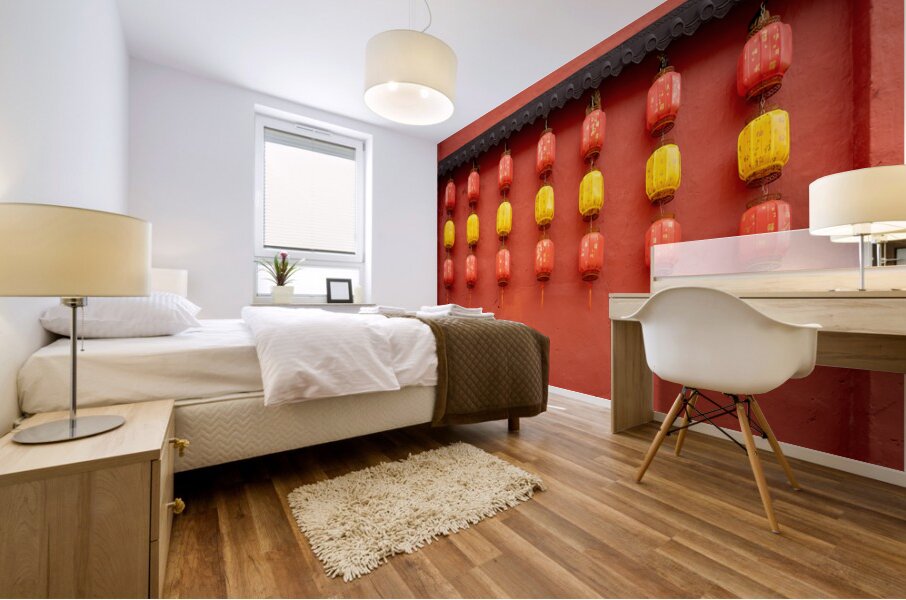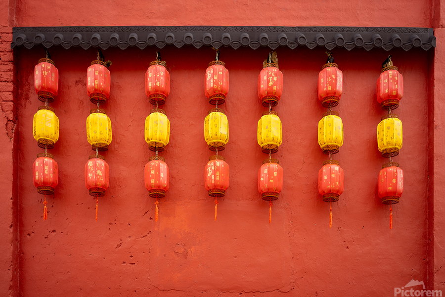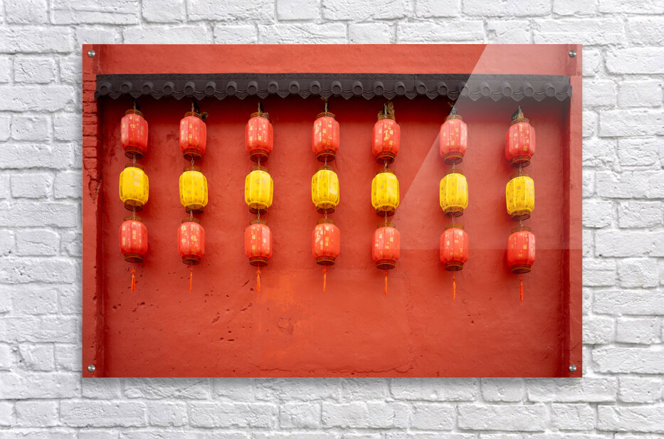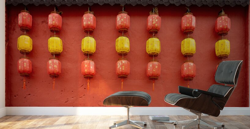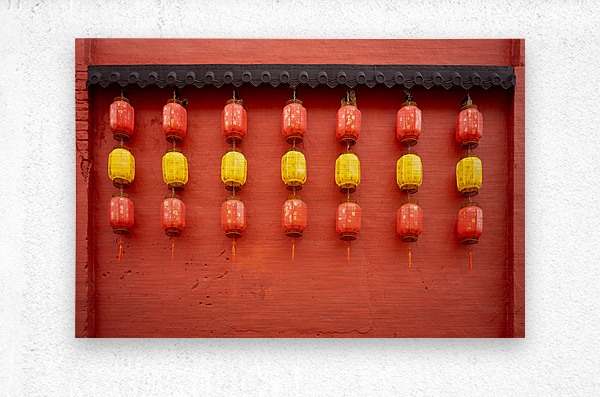 Red and yellow Chinese lanterns hang in front of a red wall in Ipoh Malaysia creating a vibrant display of colour and tradition. Their delicate forms stand out against the bold backdrop evoking the cultural charm of this historic town. A great photograph for those with an appreciation for Southeast Asian heritage and decorative details.