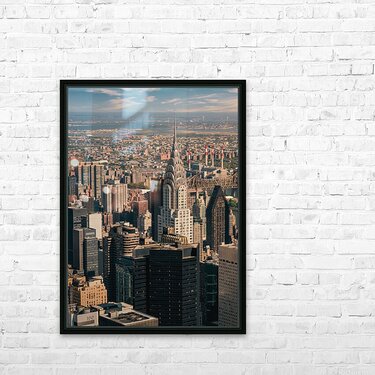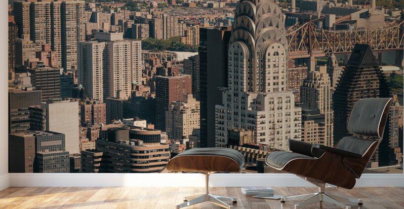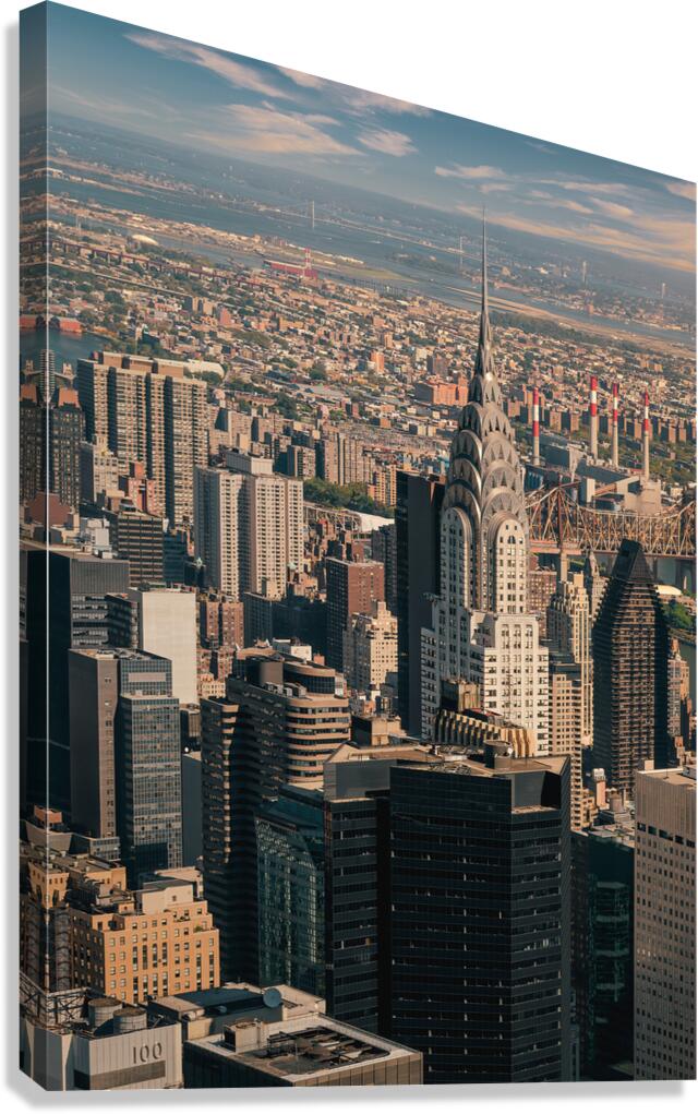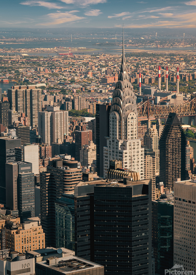 A view across East Midtown from the top of the Empire State Building with the iconic Chrysler Building rising among the surrounding skyline. The citys dense architecture unfolds towards the East River capturing the energy and grandeur of New York. A perfect photograph for those drawn to the timeless appeal of urban landscapes.