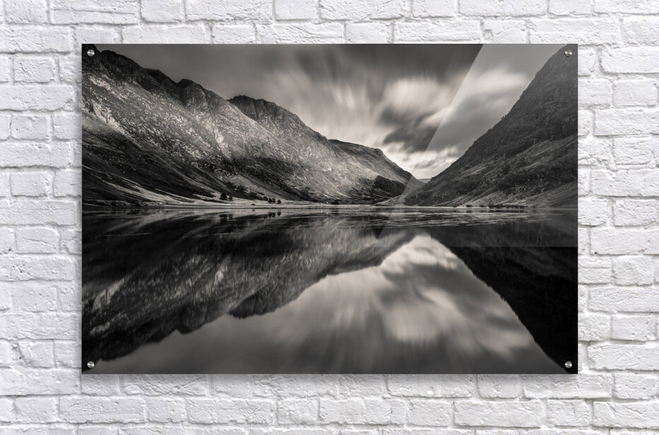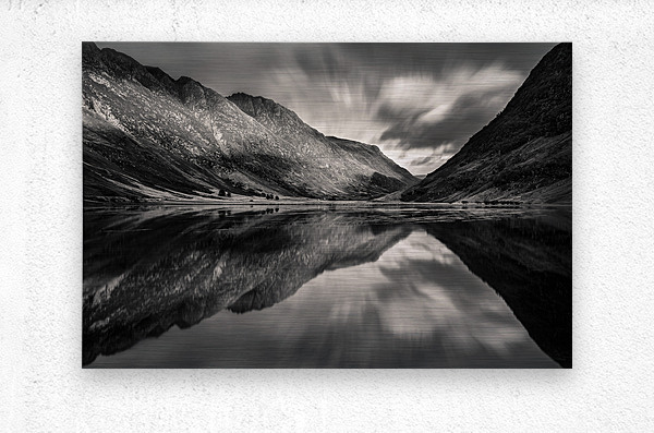 A dramatic view of mountain reflections in Loch Achtriochtan nestled within the beautiful landscape of Glencoe in the Scottish Highlands. The still water creates a near-perfect mirror blurring the boundary between land and sky. A great photograph for those who connect with the quiet beauty and sense of solitude found in Scotland’s wild places.