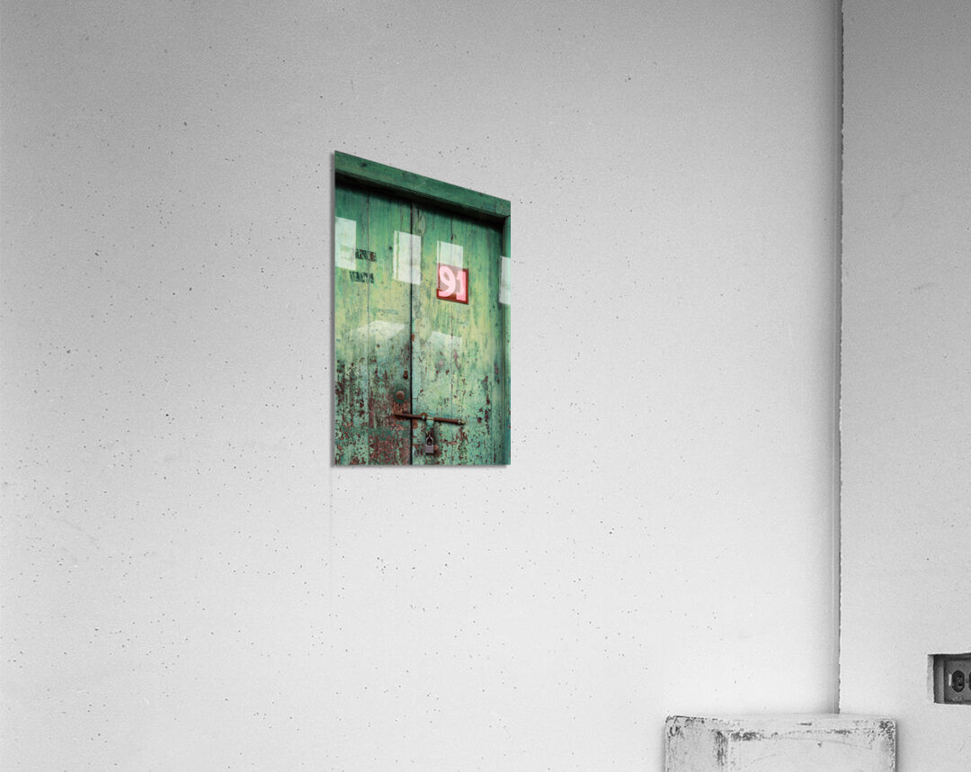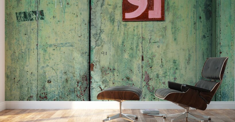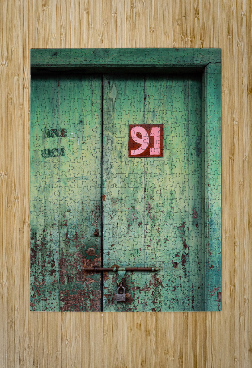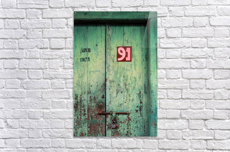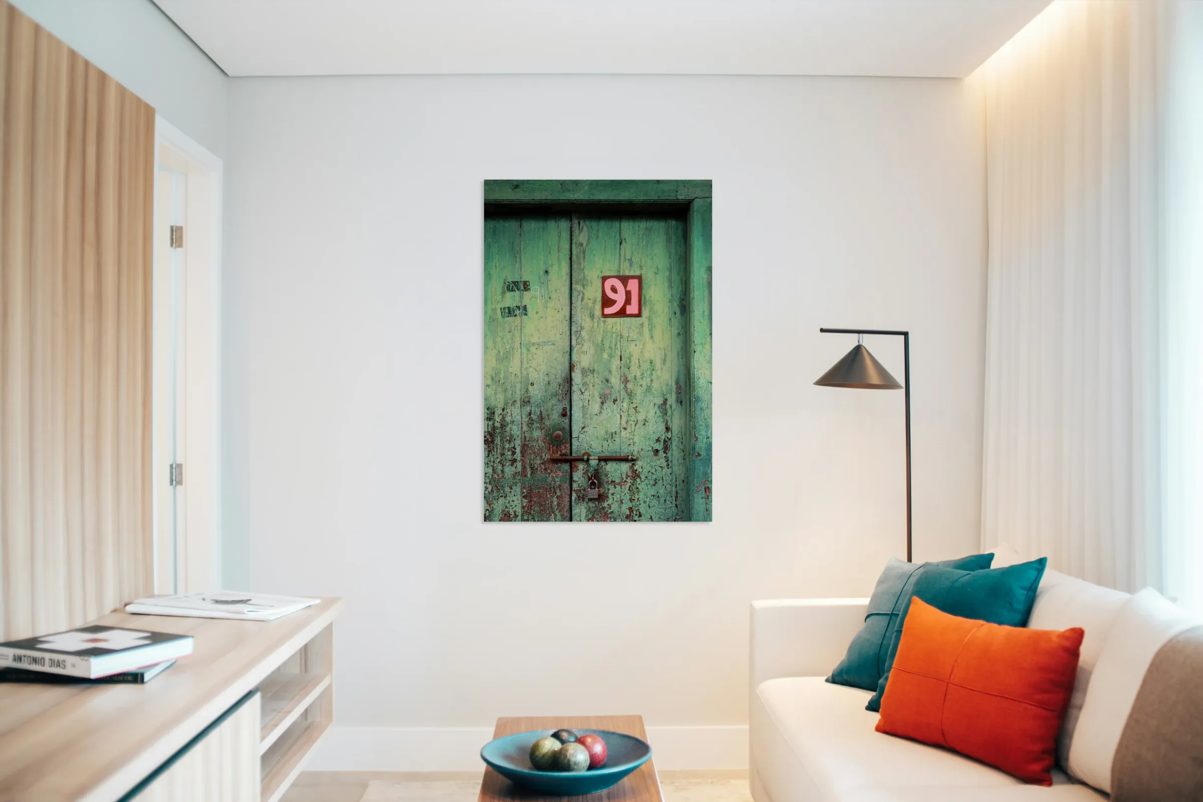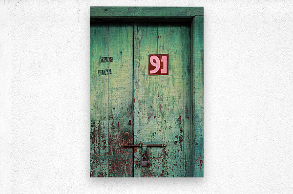 A weathered green door in Penang Malaysia its peeling paint revealing layers of age and wear. The number 91 displayed in bold red contrasts against the faded wood standing as a simple yet striking detail. A great photograph for those drawn to rustic textures and the character of old architecture.
