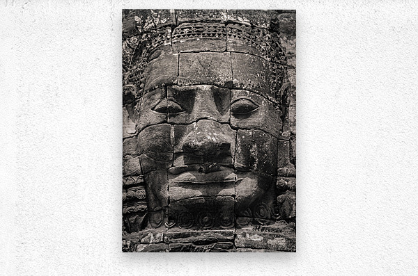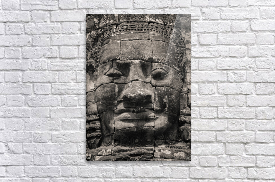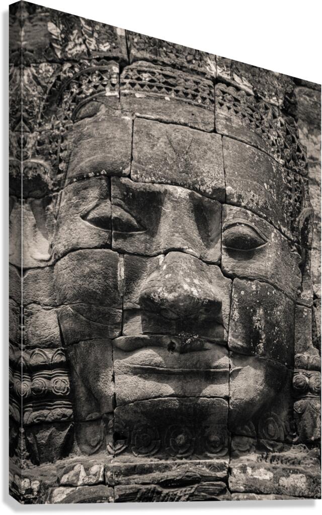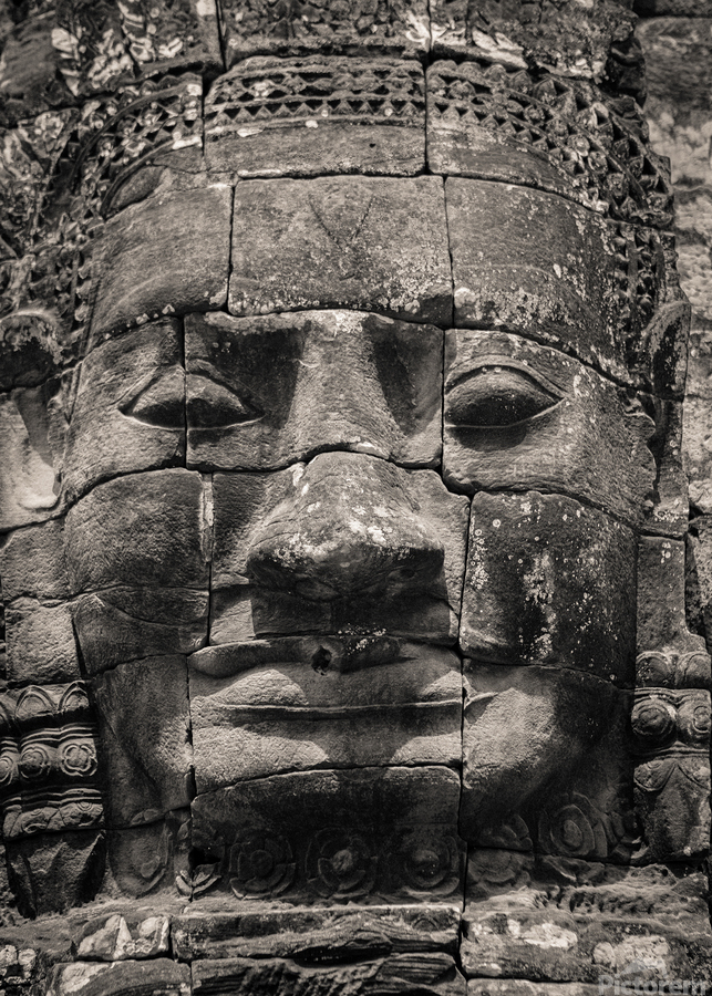 The eroded stone face of an ancient carving in Angkor Cambodia gazes out with a timeless enigmatic presence. Worn smooth by centuries of wind and rain its softened features reflect the passage of time yet the spirit of the Khmer Empire lingers in its expression. A great photograph for those drawn to the history artistry and enduring legacy of Angkor’s sacred ruins.