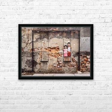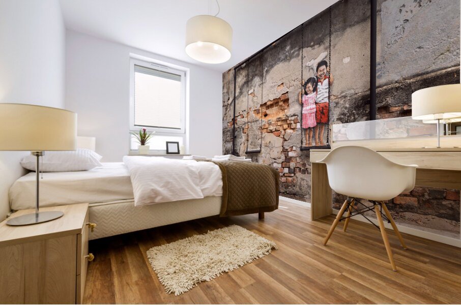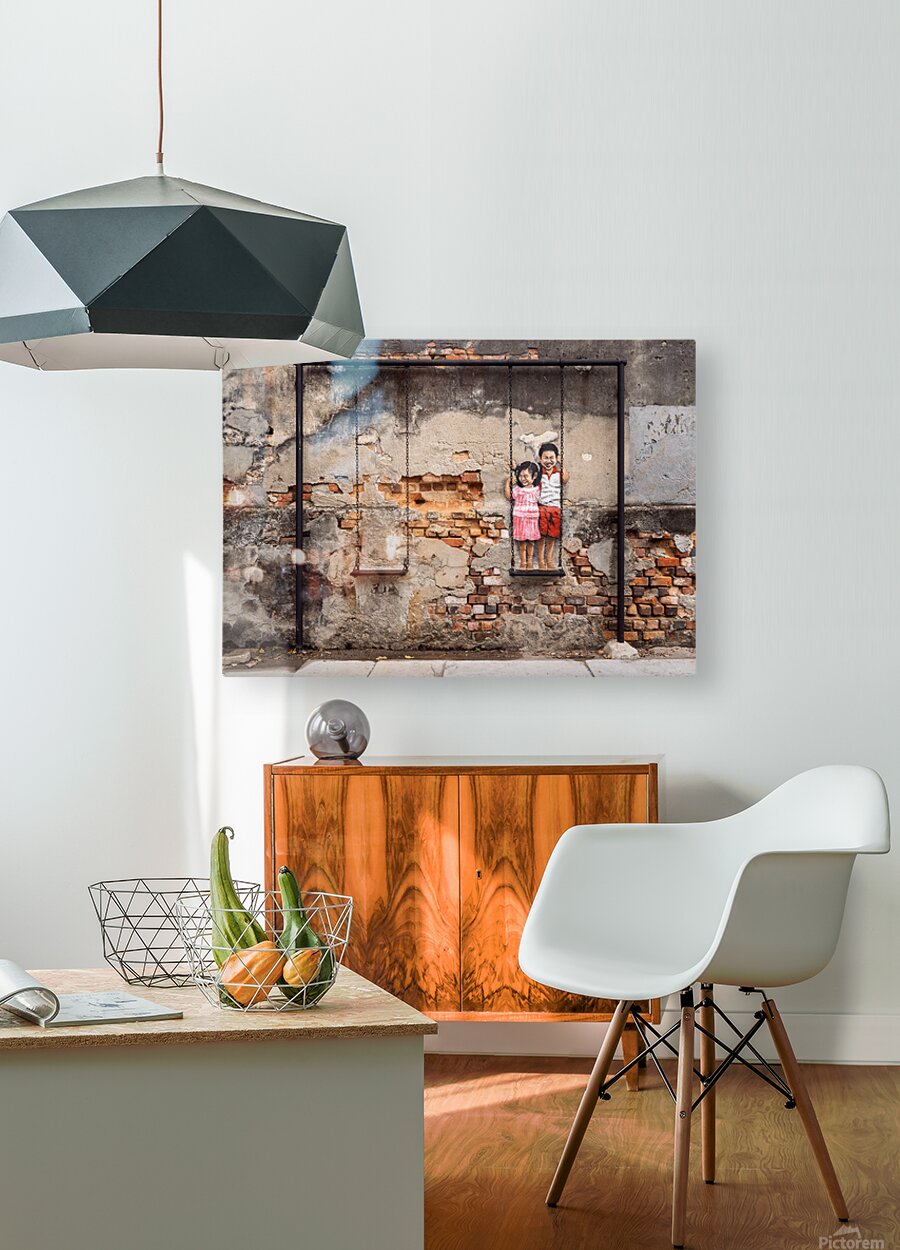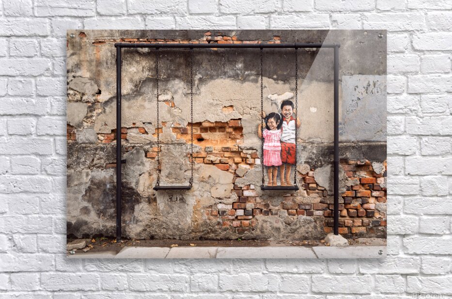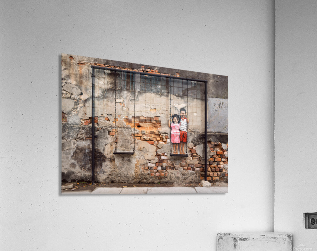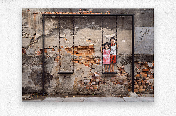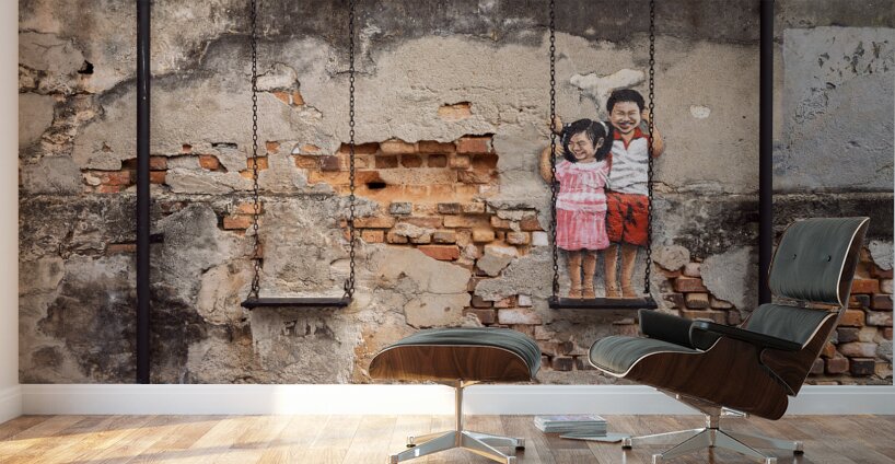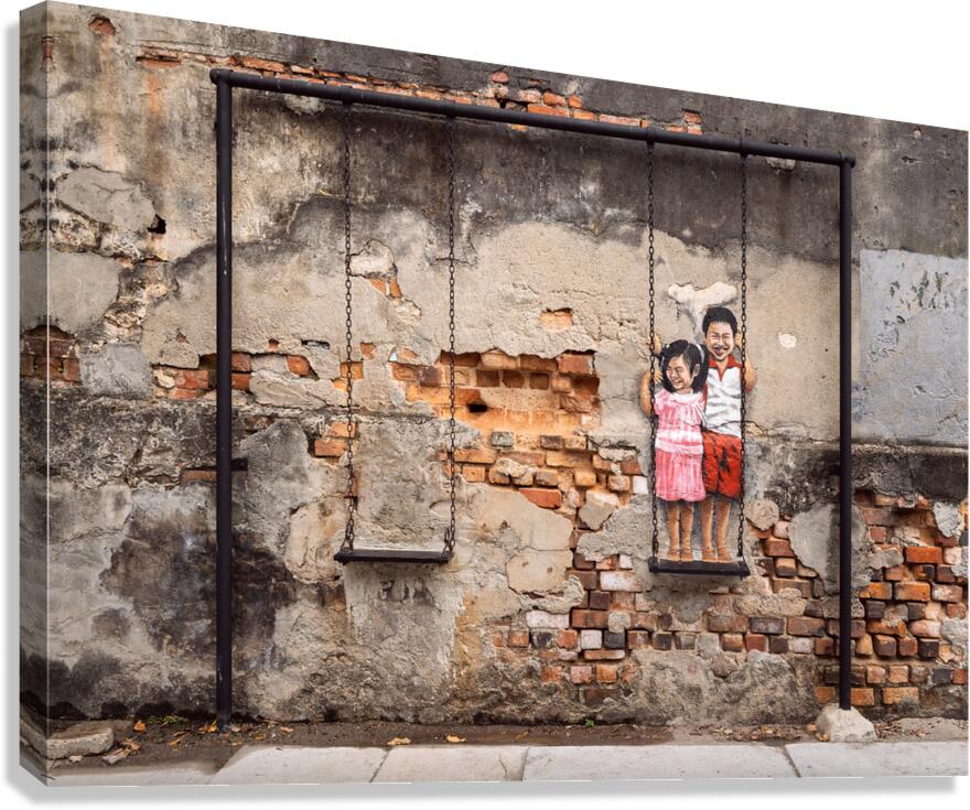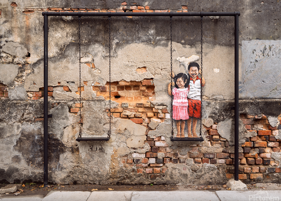 Street art depicting two children smiling and playing on a swing brings life to a weathered wall in the backstreets of George Town Penang Malaysia. The painted figures of a young boy and girl stand on a real swing blending art with reality in a way that feels both playful and nostalgic. A great photograph for those who appreciate urban creativity and the charm of storytelling through street art.