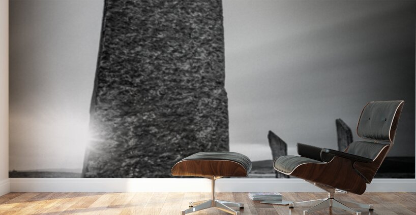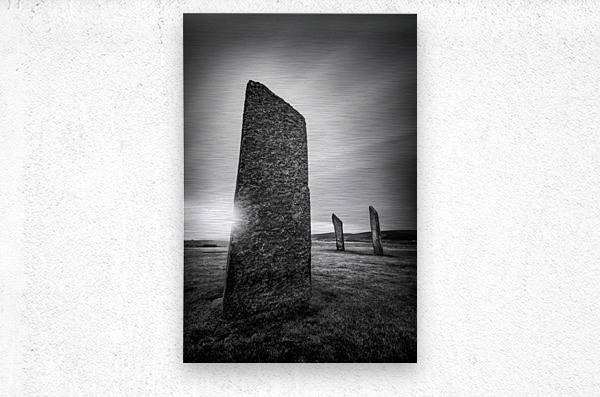 The Standing Stones of Stenness on Orkney Scotland captured at sunrise as the sun peeks from behind the ancient stones. Light and shadow carve out their weathered surfaces adding a sense of mystery and timelessness to the scene. A great photograph for those drawn to the history and atmosphere of Scotland’s prehistoric landscapes. ..... Please Note: This image is intentionally presented with a grainy texture as part of its aesthetic.