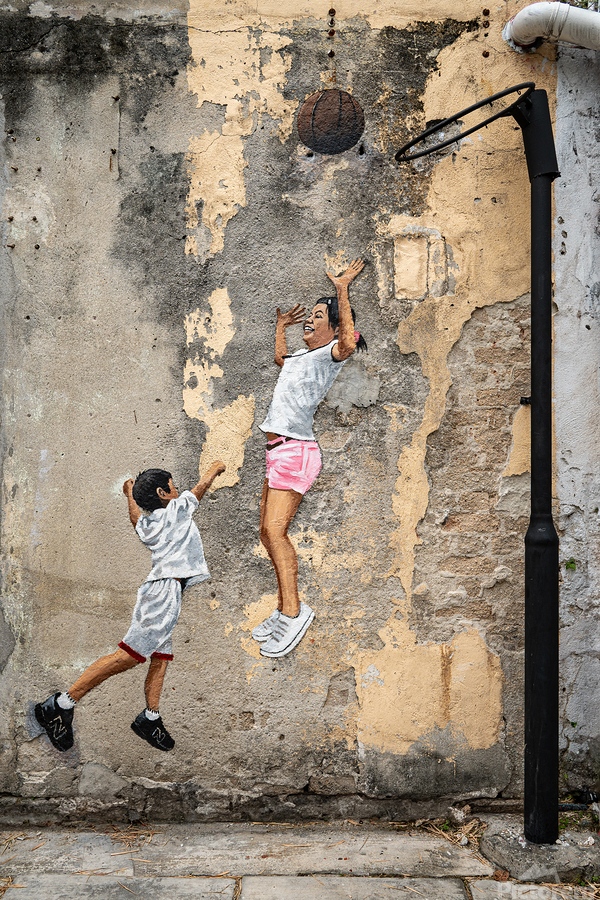 A wall mural in George Town Penang Malaysia depicting two young children playing basketball. The painted figures interact seamlessly with a real baske...[+]