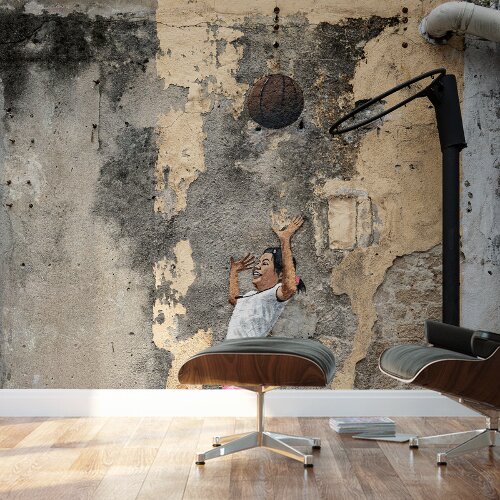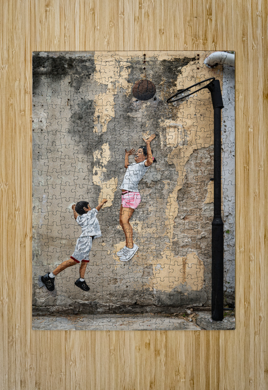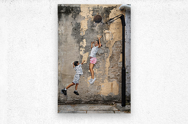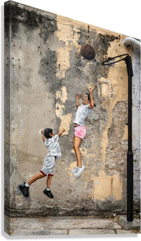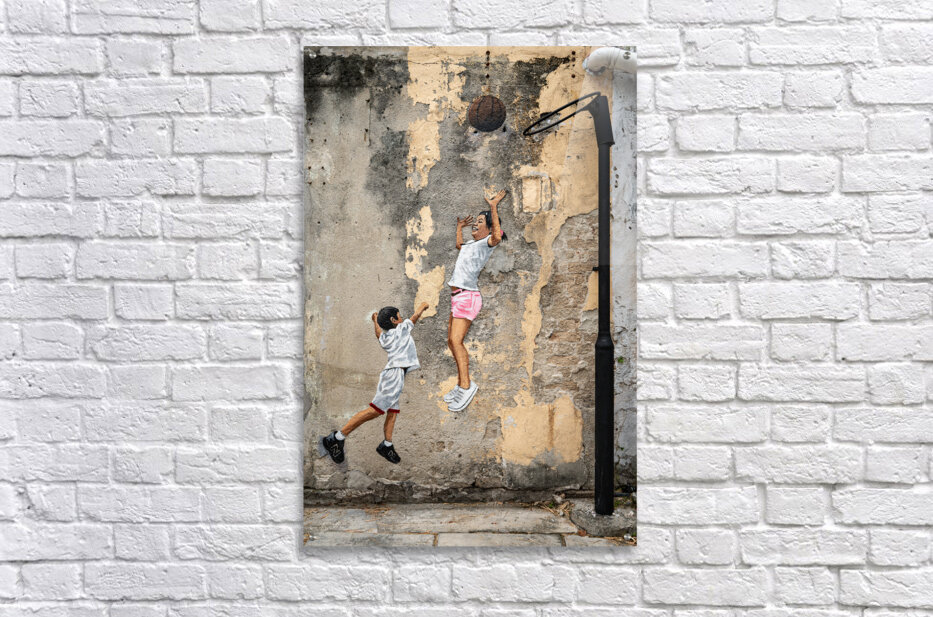 A wall mural in George Town Penang Malaysia depicting two young children playing basketball. The painted figures interact seamlessly with a real basketball hoop mounted on the wall creating a playful blend of art and reality. The weathered surface adds character enhancing the charm of this urban street scene. A great photograph for those who appreciate creative street art and the way it transforms everyday spaces.