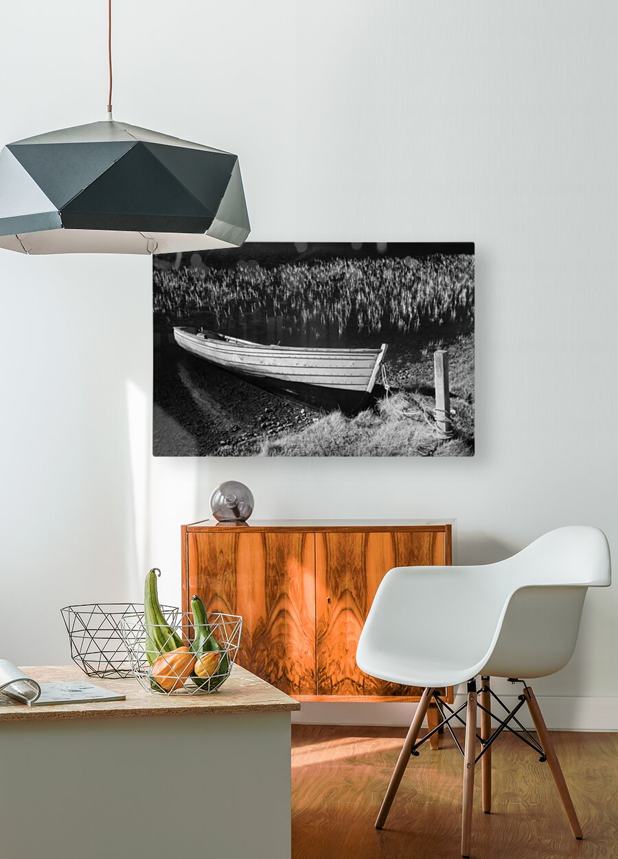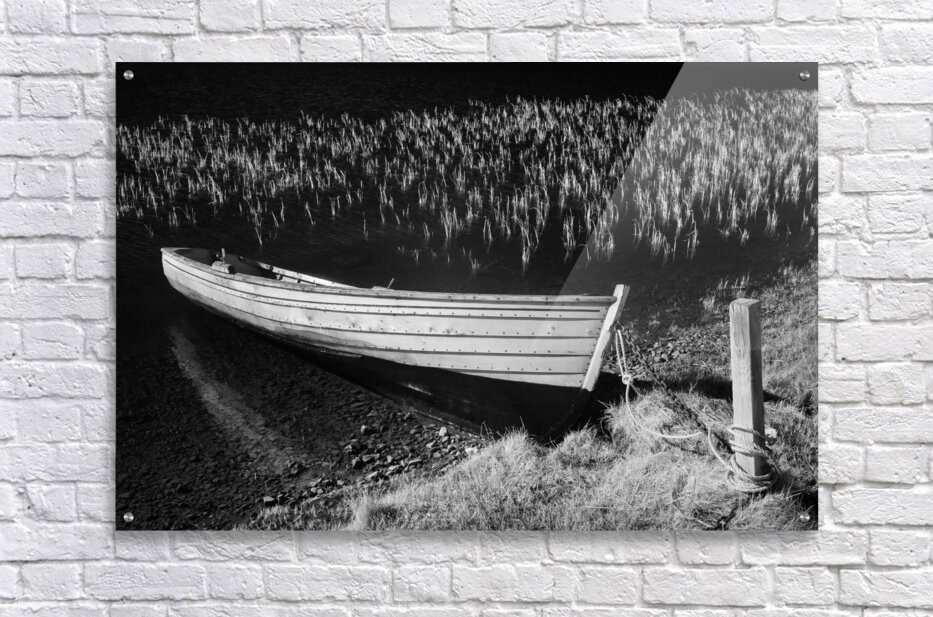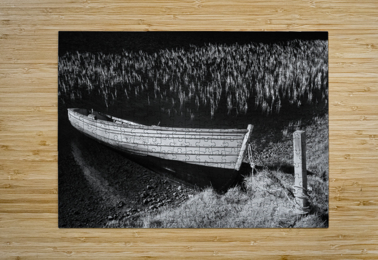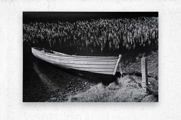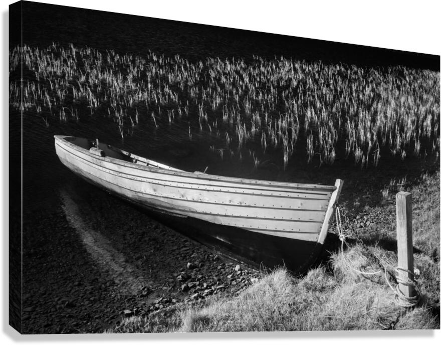 An infrared view of a rowing boat moored at the edge of Loch Awe in Assynt Scottish Highlands. The boat rests quietly against a mooring post on the shore while delicate reeds emerge from the water in the background. The infrared effect gives the scene an ethereal quality enhancing the contrast between the boat water and surrounding landscape. A great photograph for those who appreciate the stillness and otherworldly beauty of Scotland’s remote lochs.