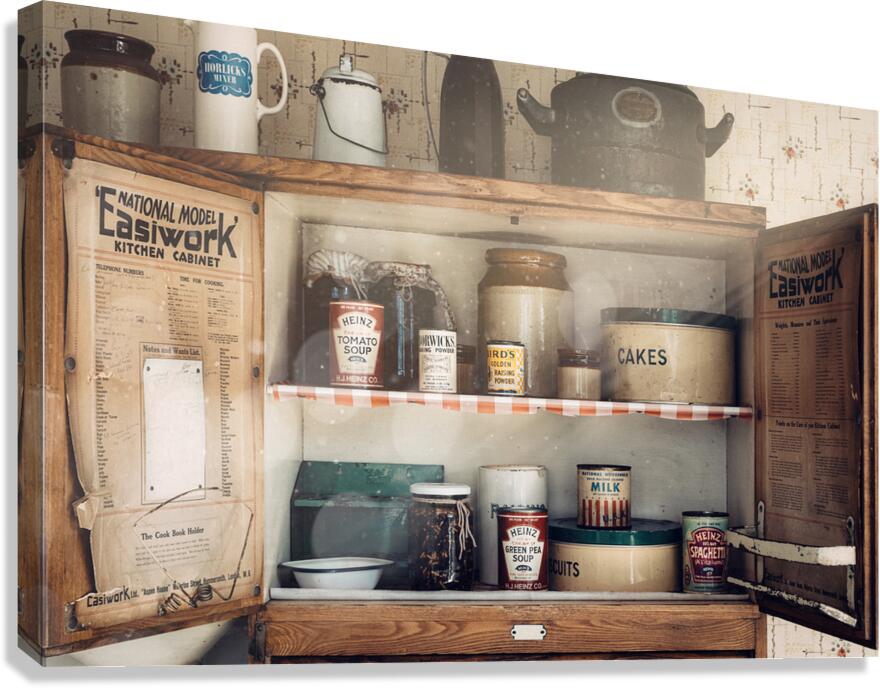 A period kitchen cupboard from the 1940s captured at Beamish County Durham with its door open to reveal a collection of vintage cake and biscuit tins along with old soup tins. The worn surfaces and familiar branding evoke a real sense of nostalgia transporting you to a time when pantries were stocked with simple well-loved essentials. A great photograph for those who appreciate vintage kitchenware and the charm of everyday history.