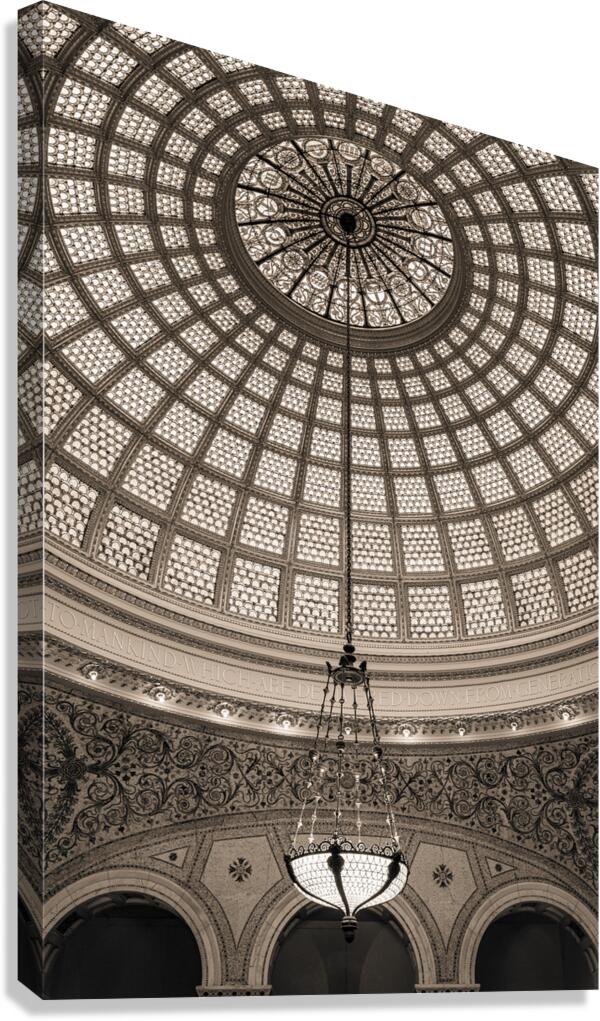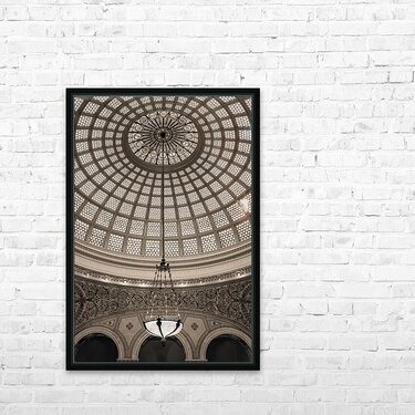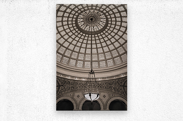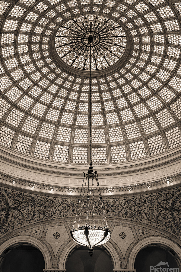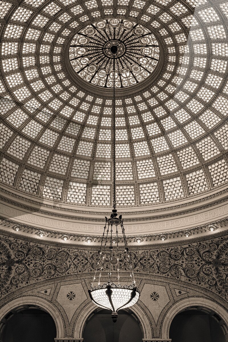 The intricate Tiffany Dome and its elegant chandelier at the Chicago Cultural Center captured in stunning detail. The dome’s elaborate glasswork and ornate patterns highlight the grandeur of this historic landmark while the chandelier adds a touch of timeless sophistication. A great photograph for those who appreciate masterful craftsmanship and the elegance of historic architecture.