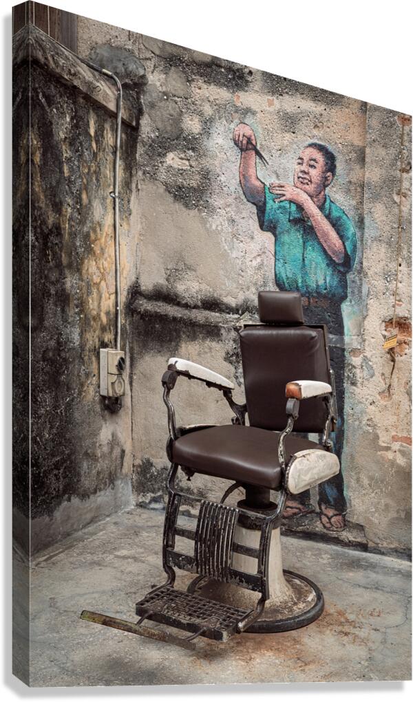 An interactive wall mural in the renowned Kwai Chai Hong area of Kuala Lumpur Malaysia. The artwork features a real vintage barber’s chair where visitors can sit perfectly positioned in front of a painted barber on the wall creating the illusion that he is trimming their hair. A great photograph for those who appreciate creative street art and the vibrant cultural charm of Kuala Lumpur.
