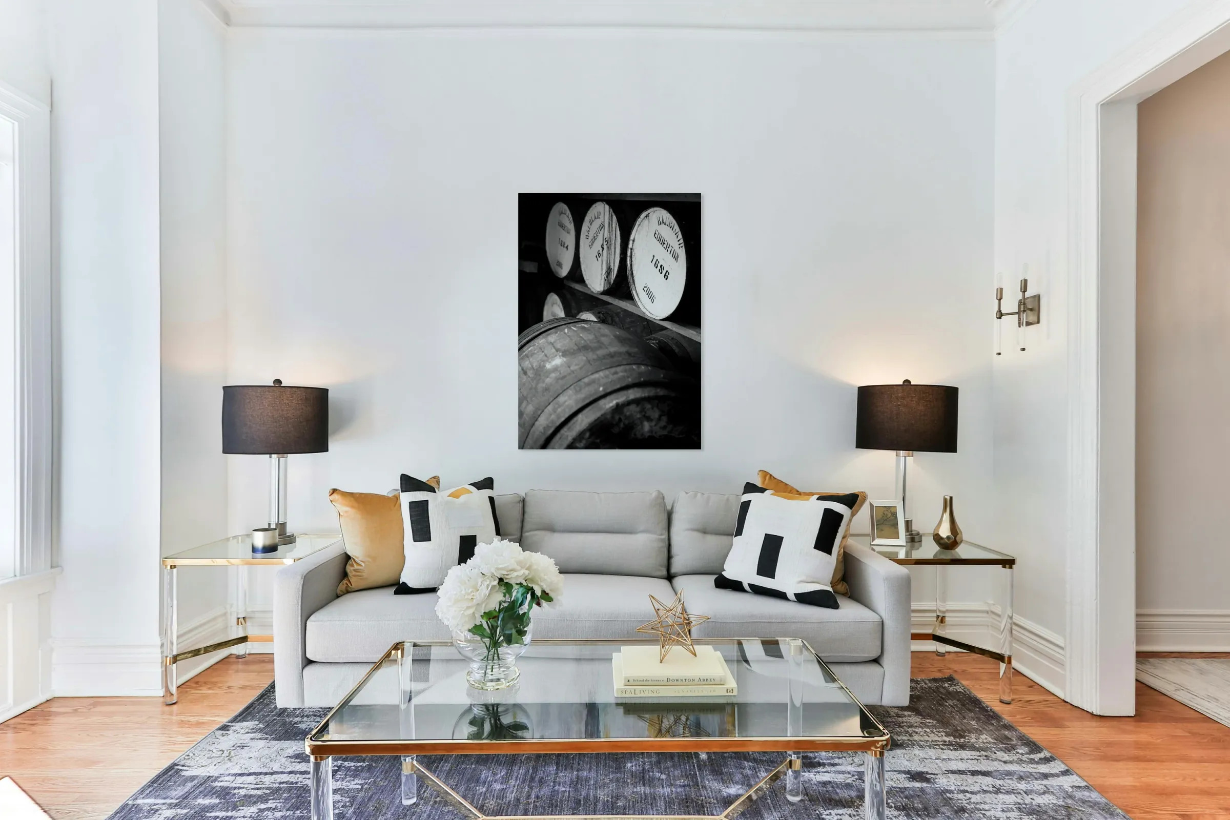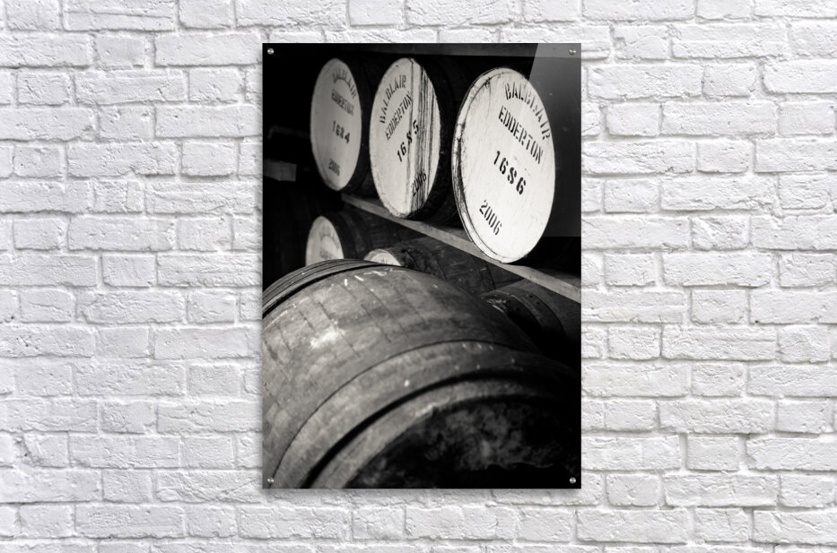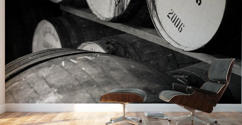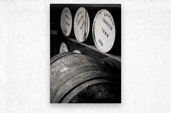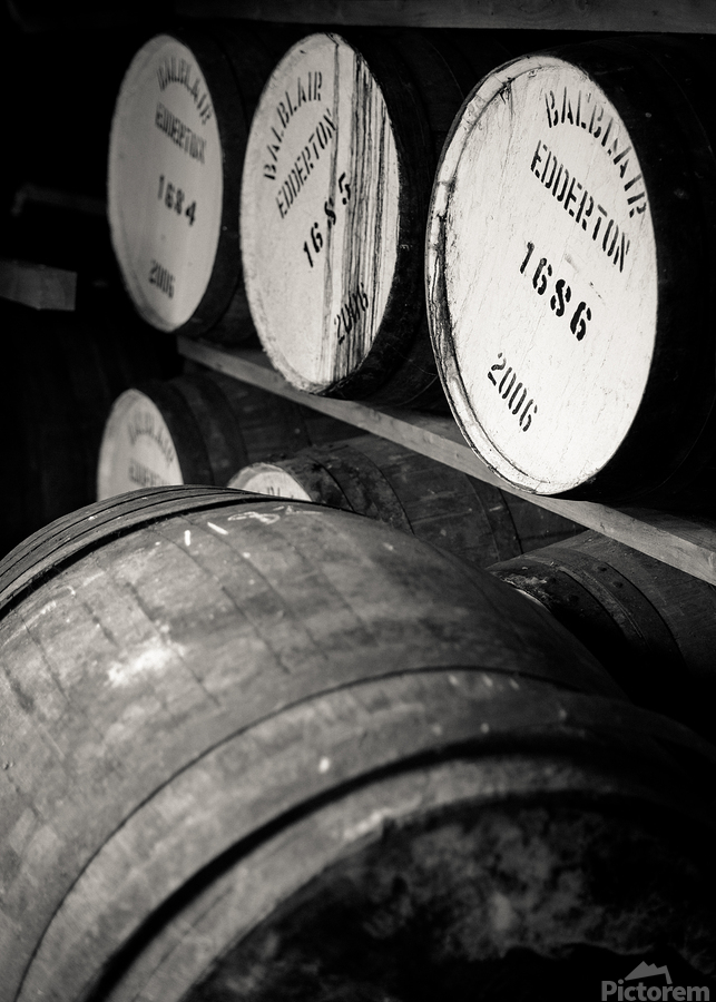 Malt whisky barrels ageing in a traditional Scottish distillery their surfaces marked by time and craft. The dim light and deep shadows add to the sense of heritage evoking the patience and skill behind every cask. One of a series capturing the whisky-making process and the atmosphere of the distillery. A great photograph for whisky enthusiasts and those who appreciate the craftsmanship of Scotland’s most iconic spirit.