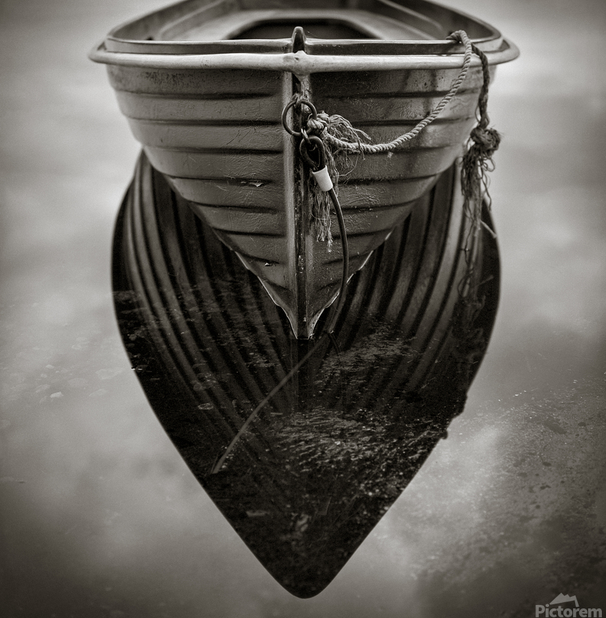 The bow of a moored rowing boat rests gently on the still waters of Loch Ard, its reflection forming a near-perfect mirror below. The glassy surface and subtle symmetry create a quiet, contemplative atmosphere. A great photograph for those who appreciate stillness and the understated beauty of Scotland’s lochs. ..... Please note: This image has a slightly grainy texture because it was photographed on analog film.